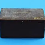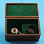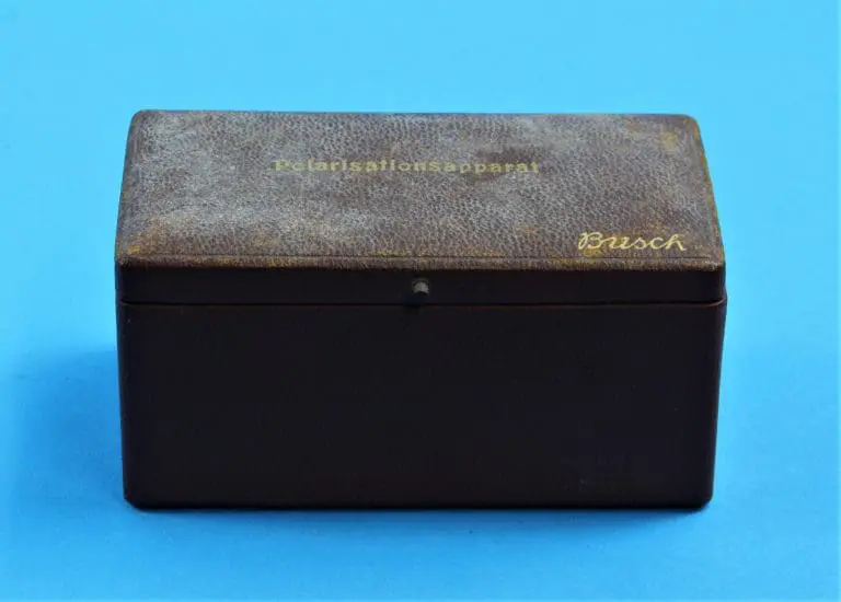 Een bruin-rood doosje met op het deksel in gouden letters: Polarisationsapparat / Busch.
