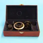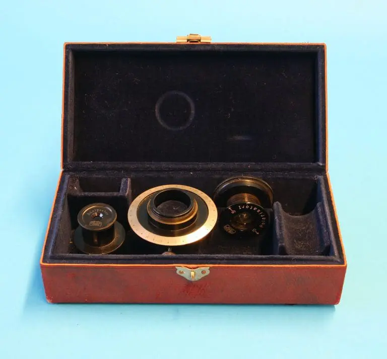 Zeiss leverde deze set in een met leer bekleed kistje, van binnen met paars fluweel bekleed.