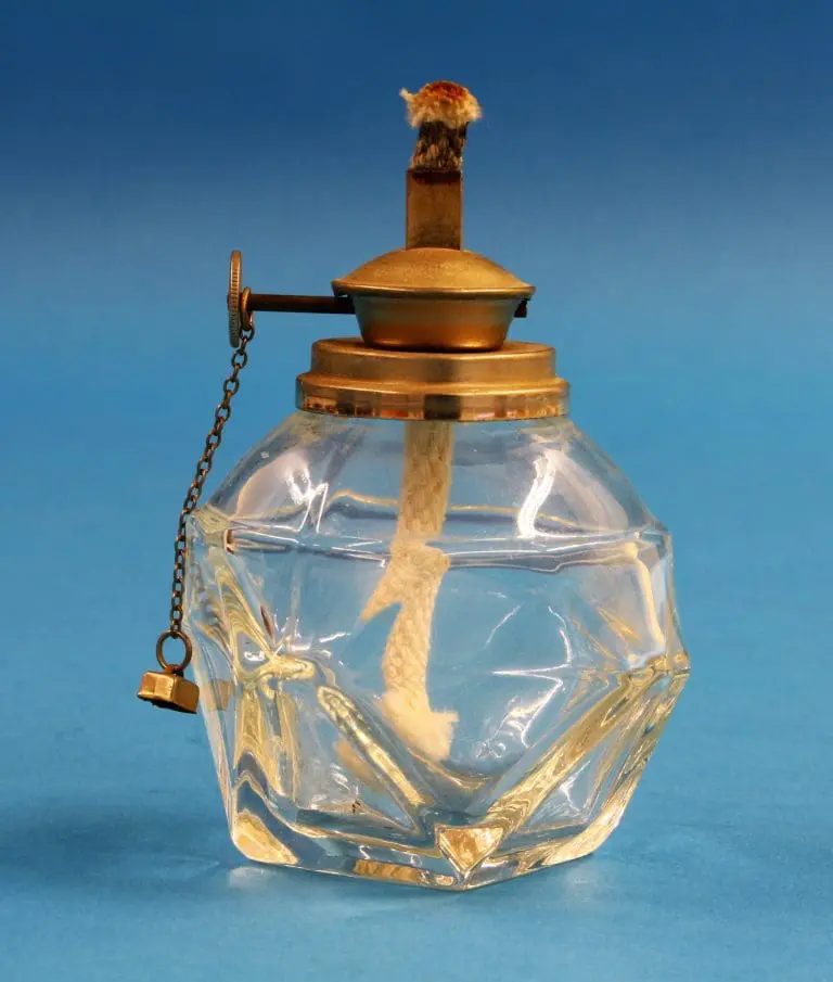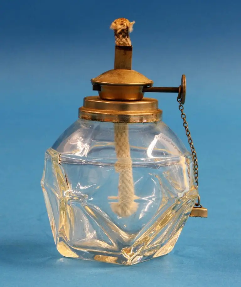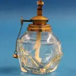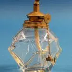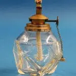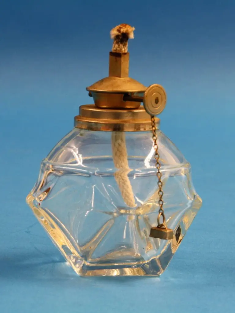 Fraai gevormd glazen reservoir met een vernikkelde kop met daarin de in hoogte instelbare pit voor een spiritusvlam. Voordeel van een spiritusvlam is dat hij niet roet.