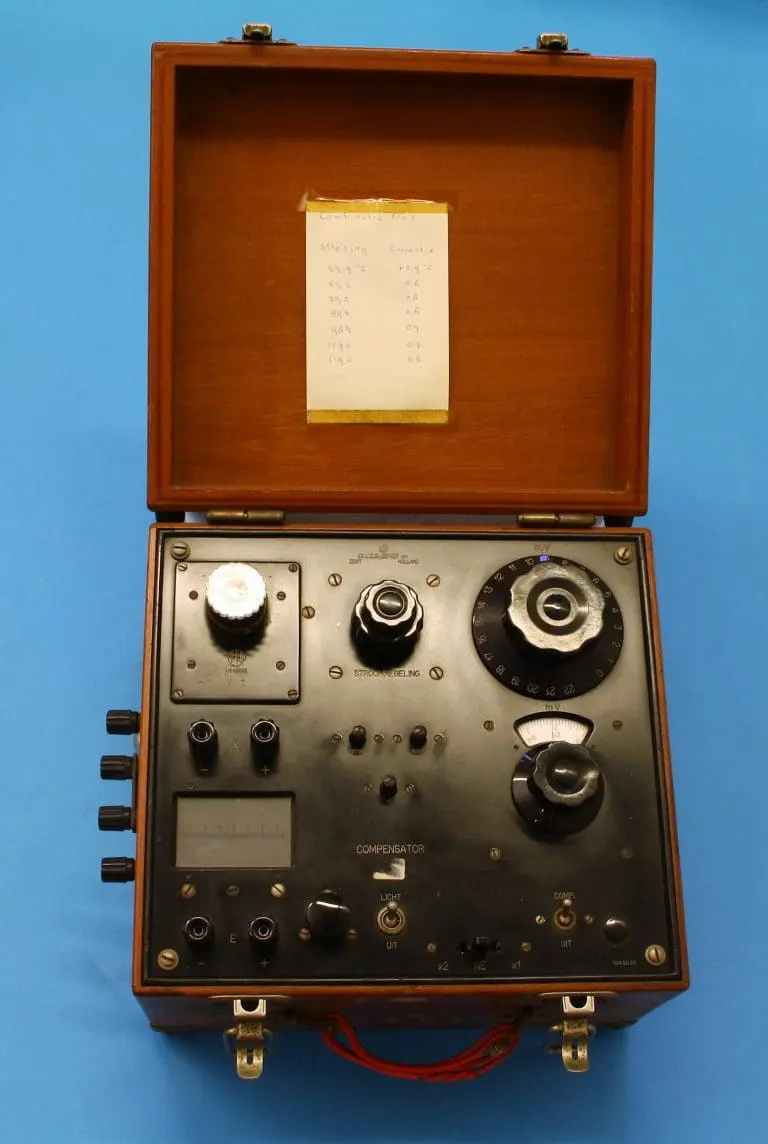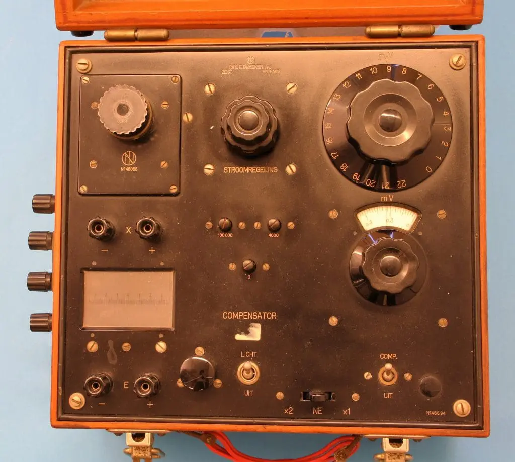Een compensator is een meetinstrument dat (kleine) gelijkspanningen nauwkeurig kan bepalen door aan een onbekende spanning een geijkte tegenspanning te geven. Deze compensator (type 2169) is ontworpen als een draagbaar instrument. Het is verwerkt in een notenhouten kist en heeft een zwart gemoffelde aluminium dekplaat. De compensator wordt gevoed met een spanning van 1,5 Volt. Er is een aansluitpunt voor de onbekende spanning (X). De tegenspanning voor de compensatie wordt verkregen door de spanning van een ingebouwd normaalelement (NE). Een lichtgalvanometer (Bleeker-nummer 45056) die circa 7× nauwkeuriger is dan de Bleeker-wijzergalvanometers, is ingebouwd.