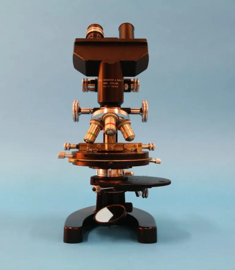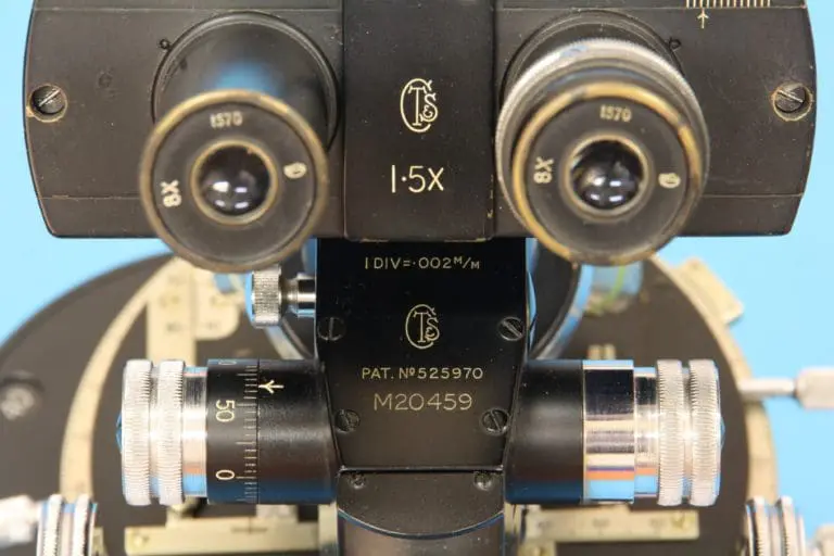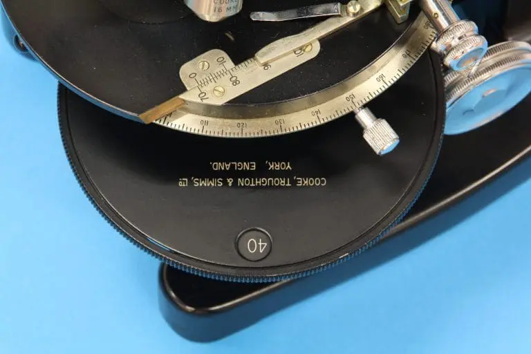 This is the ‘M2000’ type stand, introduced by Cooke, Troughton & Simms in 1942, this specimen is of a later date and it is provided with a phase contrast condenser and corresponding objectives. The ‘M2000’ was marketed for ‘routine and research investigations’. The stand uses a modified horseshoe foot and the limb can be tilted over 90 degrees, there is a clamping screw. There is a large revolving mechanical stage with a 360 degrees scale. Below the stage the condensor with its set of four phase contrast rings, with correspond with the four phase contrast objectives in the objective revolver. The microscope has a mirror in a bracket. Coarse adjustment is by rack and pinion. The fine adjustment uses a complex mechanism acting on the nosepiece with the objective revolver. The microscope has a binocular tube with adjustable eye distance and one eyepiece has a compensating ring.