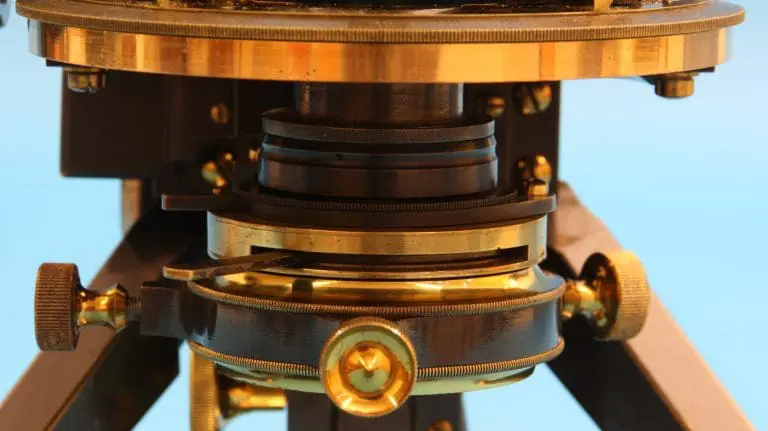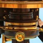 The instrument is very solidly and well built because of the desired mechanical stability. In order to be able to discern very small structures in diatoms the condensor can be positioned out of the optical axis, there is a rotating and adjustable mechanical stage with fine movements in both the X and Y axis. The tube length is adjustable with rack and pinion to compensate for the spherical aberration of objectives. Coarse adjustment acts by rack and pinion in the usual way. Fine adjustment is by means of a micrometer screw acting on a lever which moves the block carrying the coarse adjustment and the body tube. There is a triple objective changer.