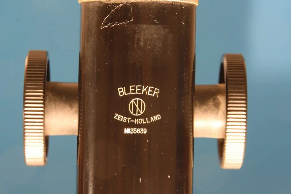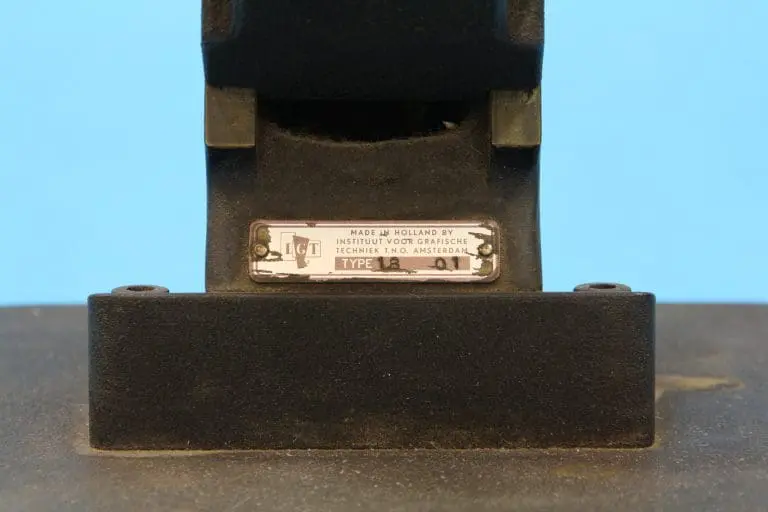 Microscope tube: BLEEKER / (logo N O I) / ZEIST-HOLLAND / No 35639; Foot: MADE IN HOLLAND BY / (logo IGT) INSTITUUT VOOR GRAFISCHE / TECHNIEK T.N.O. AMSTERDAM / TYPE 18 – 01. |