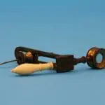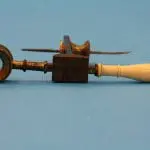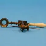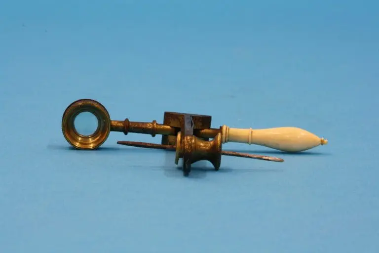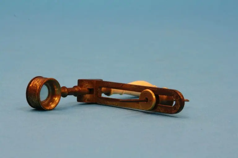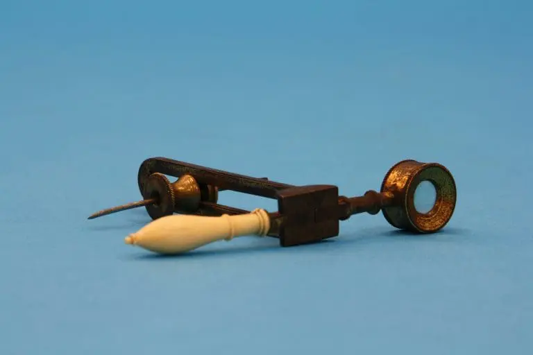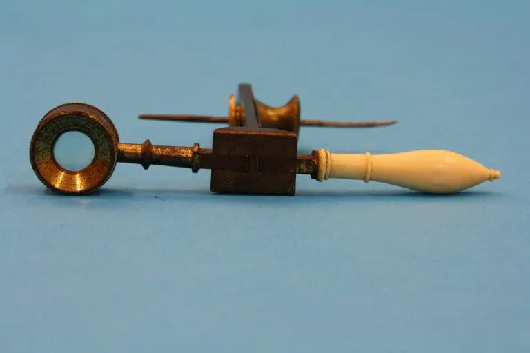 The instrument has a brass strip with a double hinge on one end. On one side the bone handgrip, on the other side the simple magnifier (biconvex lens) in a holder. In the brass strip is a slit for a sleeve in which a simple object holder (a double sided pin) can be clamped.