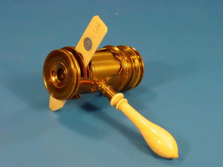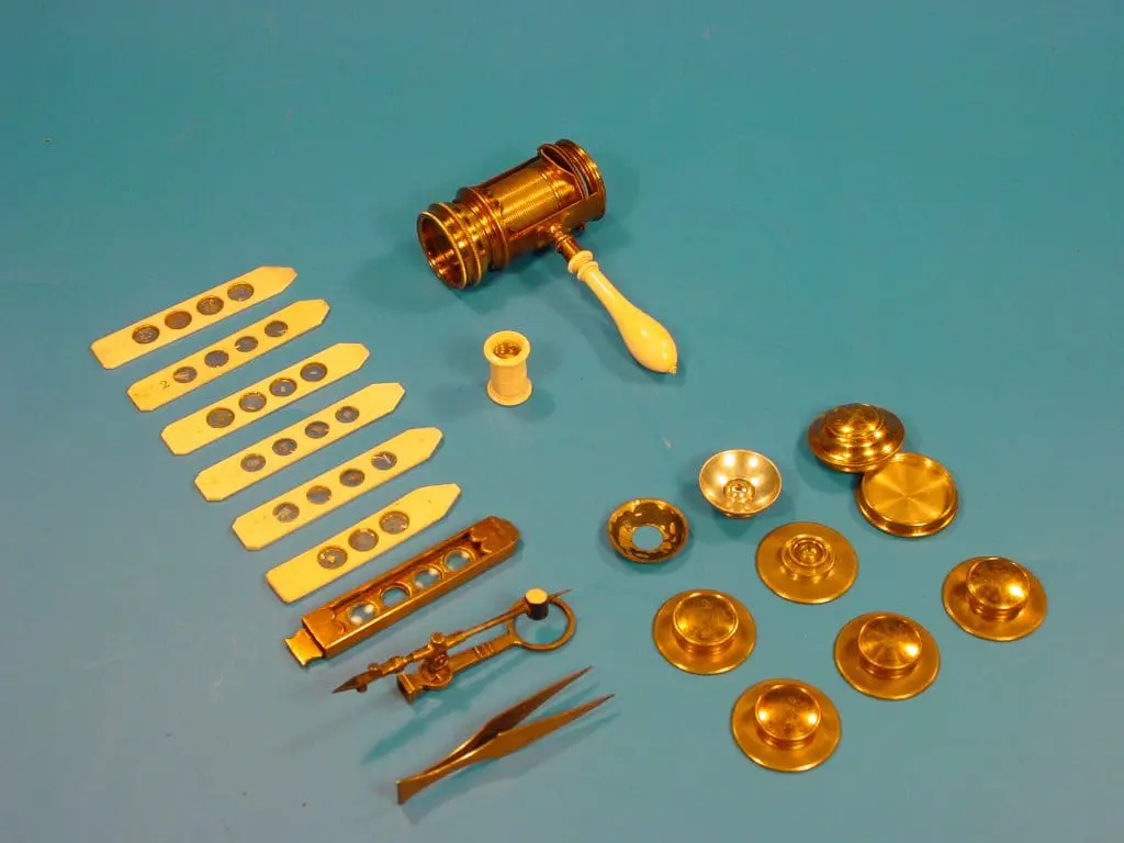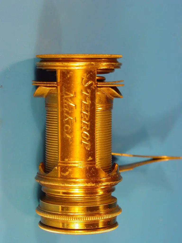 Dit exemplaar uit de tweede helft van de achttiende eeuw onderscheidt zich in niets van de vroegere exemplaren van de hand van Culpeper. Het instrument bestaat uit een messing buisje waarin twee sleuven zijn uitgezaagd. Aan de ene zijde kunnen de objectieven geschroefd worden, aan de andere zijde bevindt zich de condensorlens, deze is in een tweede tubus gemonteerd die in de eerste schroeft. Tegen deze tweede buis drukken twee plaatjes messing blik waartussen een preparaatschuifje geschoven kan worden. Een veer tussen deze plaatjes en het objectief zorgt ervoor dat het preparaat bij in- en uitschroeven van de binnenbuis op zijn plaats blijft zitten. Op deze wijze is een nauwkeurige scherpstelling mogelijk. Om het microscoop goed vast te kunnen houden is op de buitentubus nog een bus bevestigd waarin een ivoren handvat wordt geschroefd.