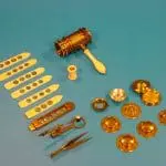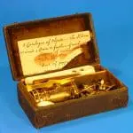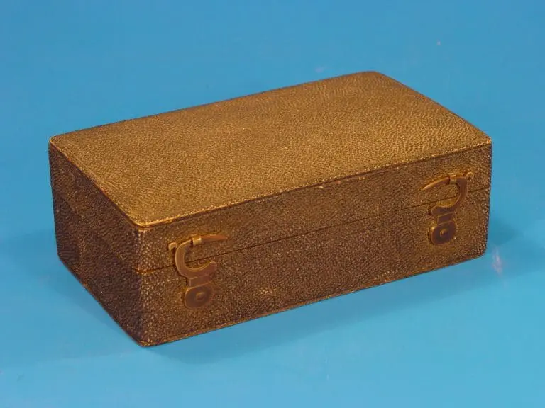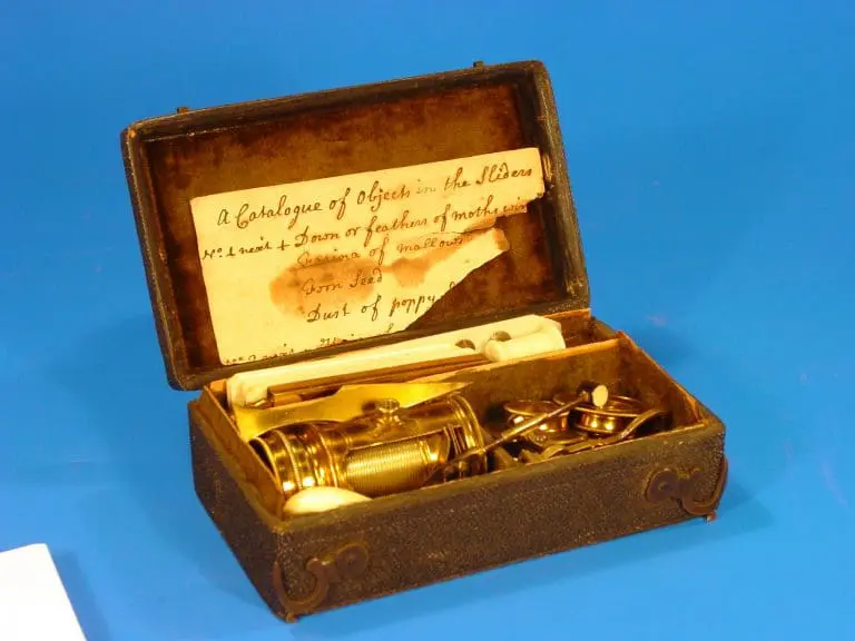 Het microscoop bevindt zich in een met haaienhuid bekleed kistje, dat van binnen met groen fluweel bekleed is.
