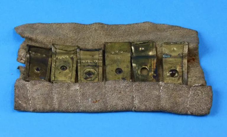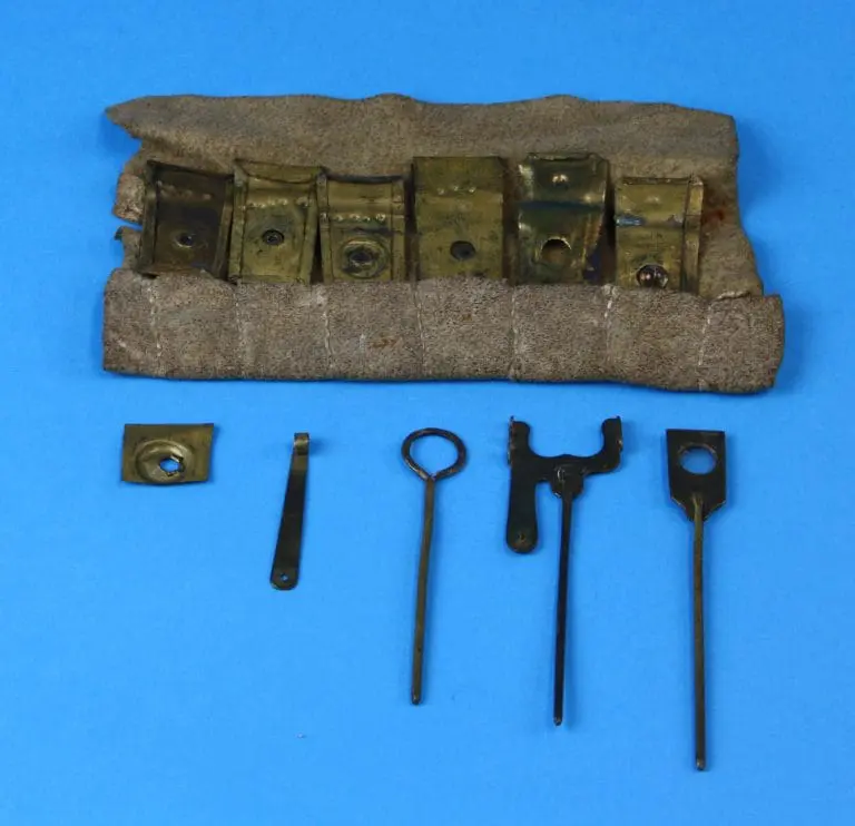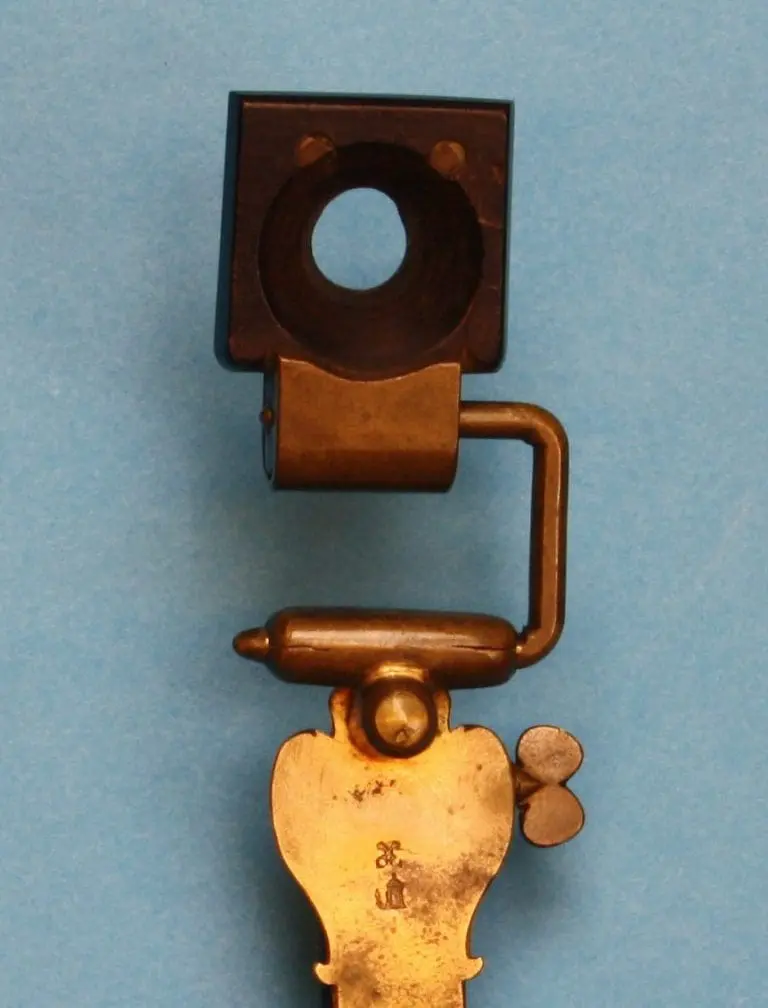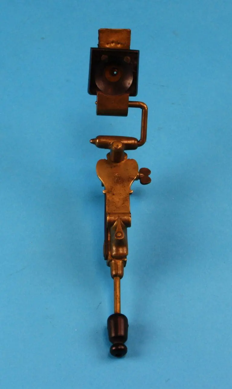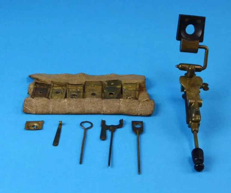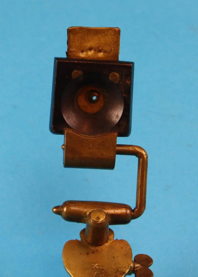 Bij het microscoop bevindt zich een zeemleren etuitje voor zes lenzen. De lensjes zijn tussen twee messing blikjes gemonteerd in een licht uitgehamerde holte.
