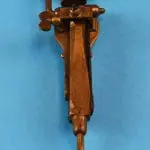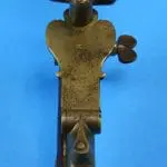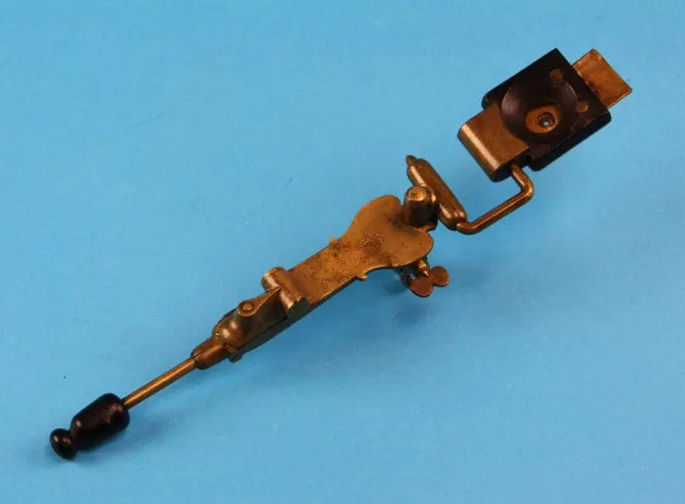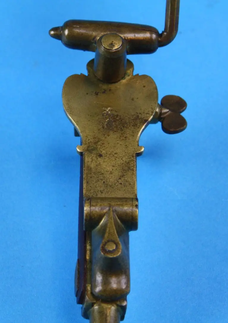 Passermicroscoop met verwisselbare lenzen, grof- en fijninstelling, met een schroef verplaatsbare preparaathouder. Het diafragmadoosje met een diafragmaschijf met vijf openingen dat bij deze microscoop hoort, is helaas niet meer aanwezig.