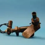 Onder de tubus zit een verloopstuk met fixeerring. Deze lijkt ook niet origineel, gezien de roestsporen en het grove formaat. Het verloopstuk houdt een lenshouder vast met een enkele lens.
