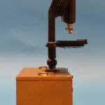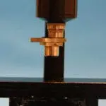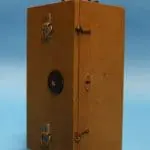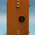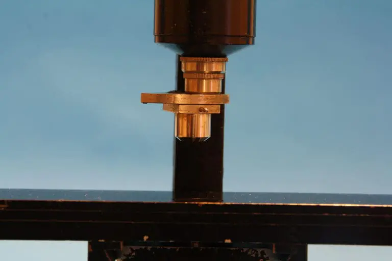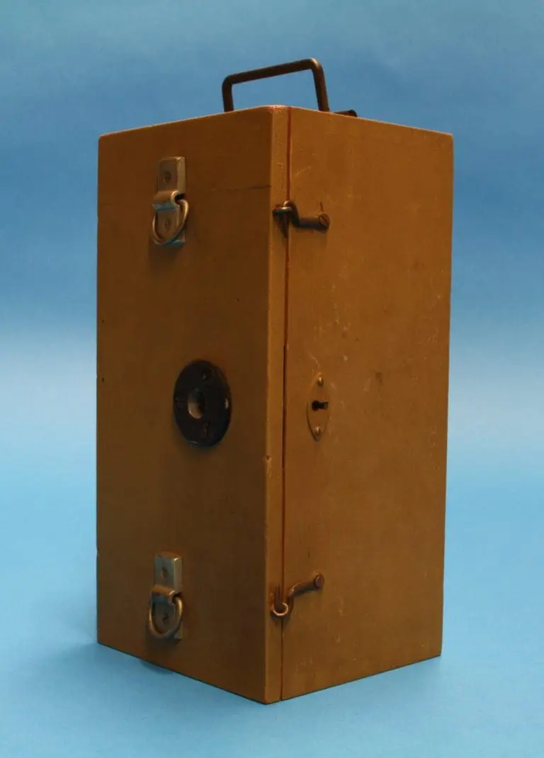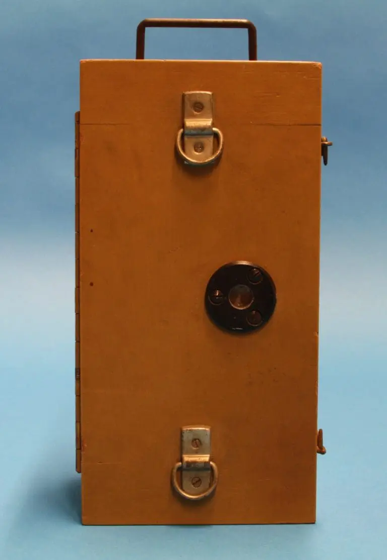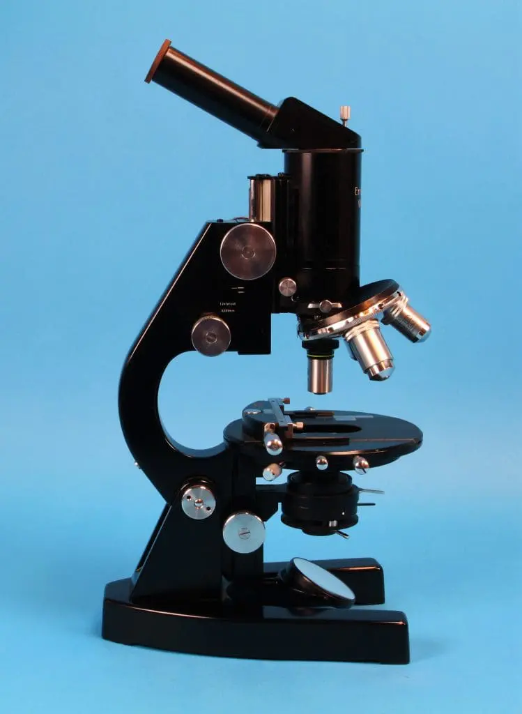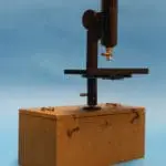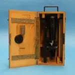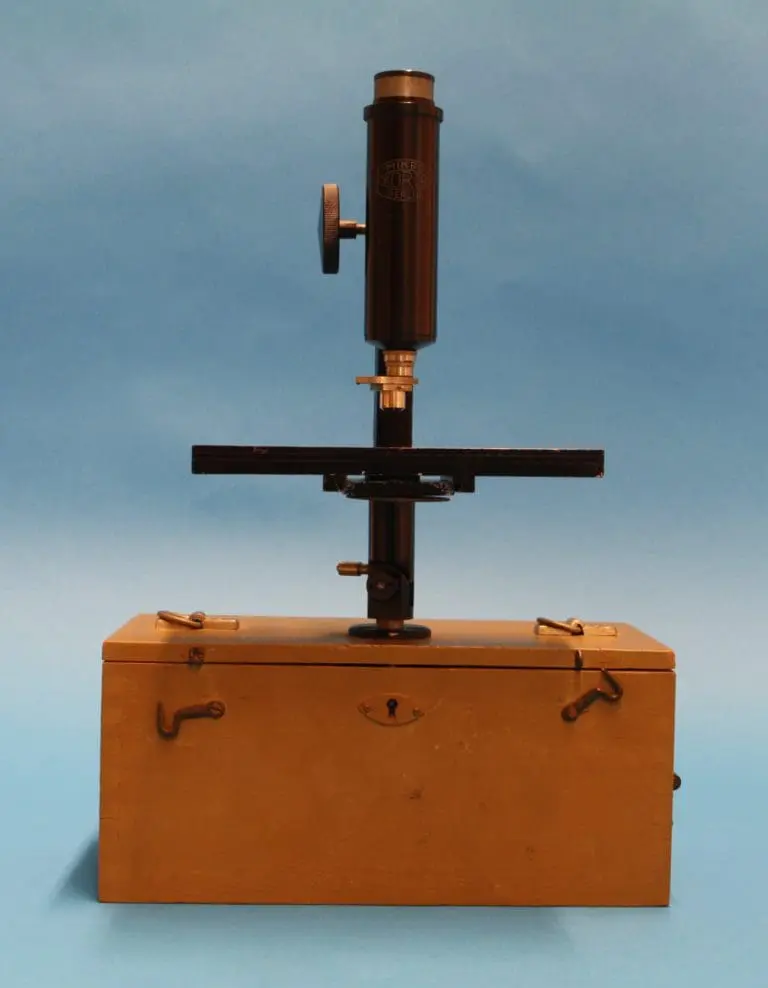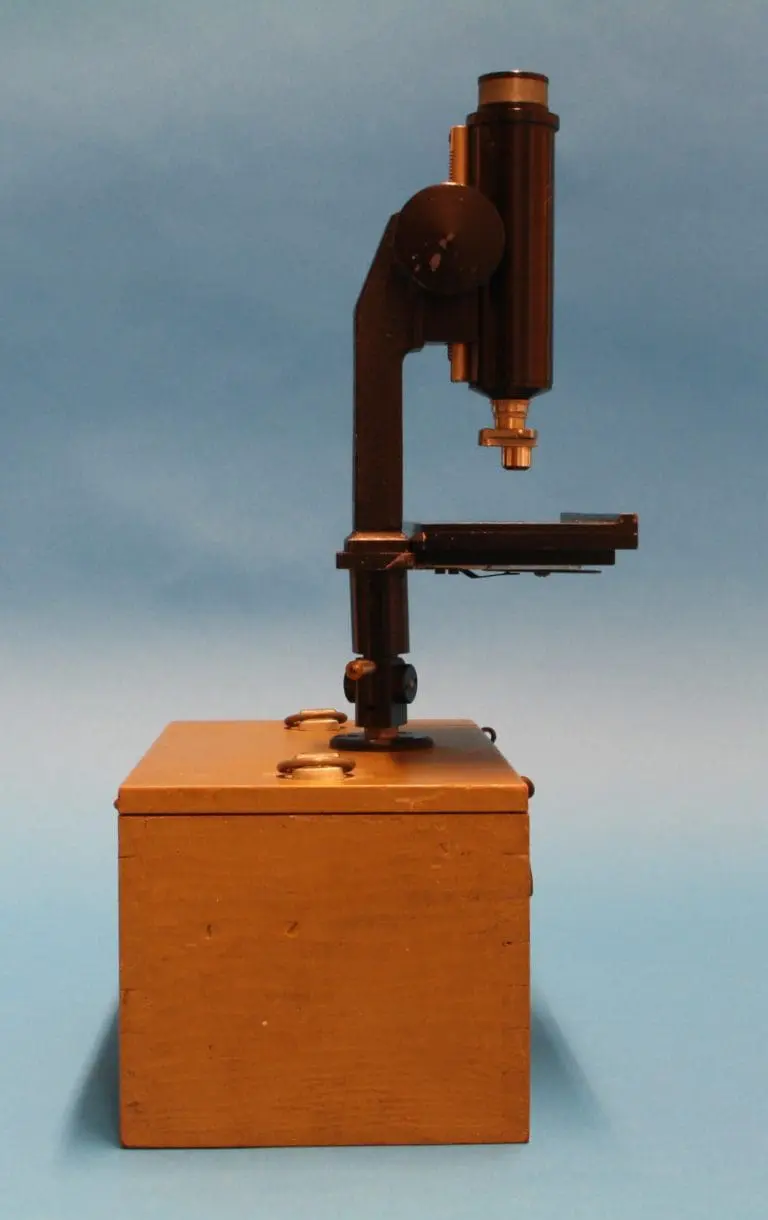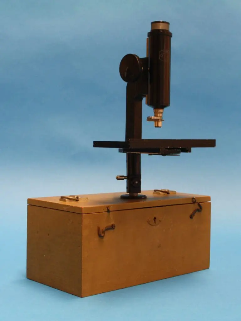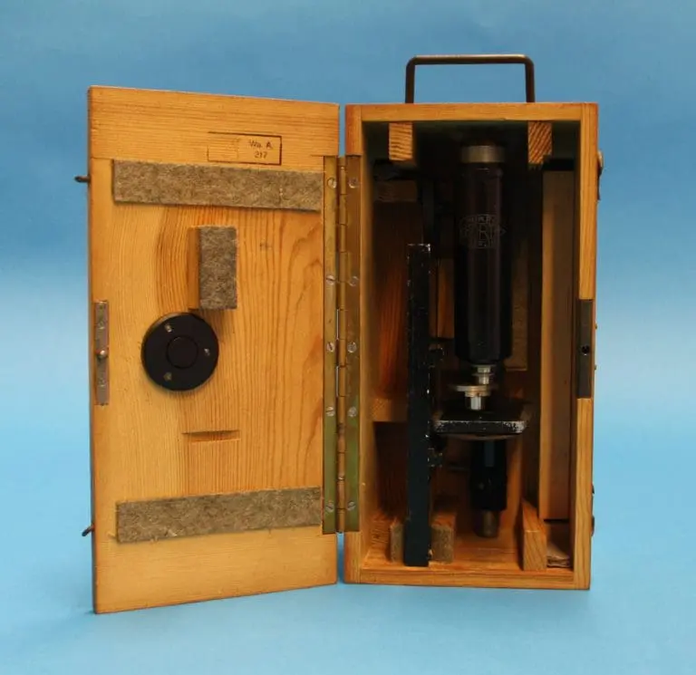 Microscoop voor trichine-onderzoek, Trichinella spiralis, een rondworm die in rauw varkensvlees of paardenvlees kan voorkomen. Het microscoop bevindt zich in een houten draagkistje, voor gebruik wordt het op het deksel in een bus geschroefd. Voorzien van een grote tafel en een objectief en oculair. Met grofinstelling middels rondsel en tandheugel. Het microscoop is oorspronkelijk bij de voormalige Duitse Wehrmacht in gebruik geweest, in de kist bevindt zich nog het stempel, waaruit het hakenkruis is verwijderd.