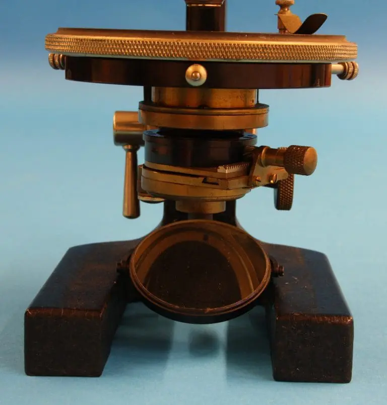 Een kantelbaar microscoop op een hamerslag gemoffelde gietijzeren voet met handgreep zoals Zeiss die in zijn ‘Bierseidel’ introduceerde. De microscoop heeft een draaibare en centreerbare ronde tafel met nog één veerclip. Onder de tafel de condensor met irisdiafragma, dat via een rondsel met tandheugel uit de optische as is te verplaatsen. Als de condensor is verwijderd kan er een houder voor een drietal verschillende diafragma’s in de condensorvatting geplaatst worden. Er is een holle en vlakke spiegel draaibaar in een beugel. De fijninstelling werkt op het blok dat de knop voor de grofinstelling bevat, deze werkt via rondsel en tandheugel in op de tubus. De tubus is voorzien van een uitschuiftubus met millimeterverdeling. Onderaan de tubus de drievoudige objectiefrevolver.
