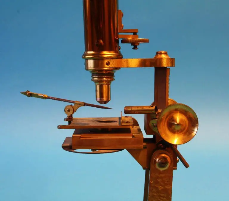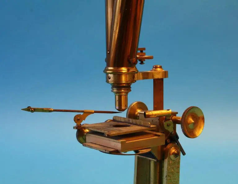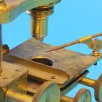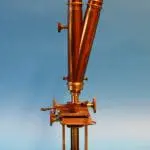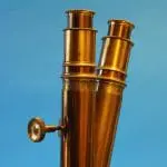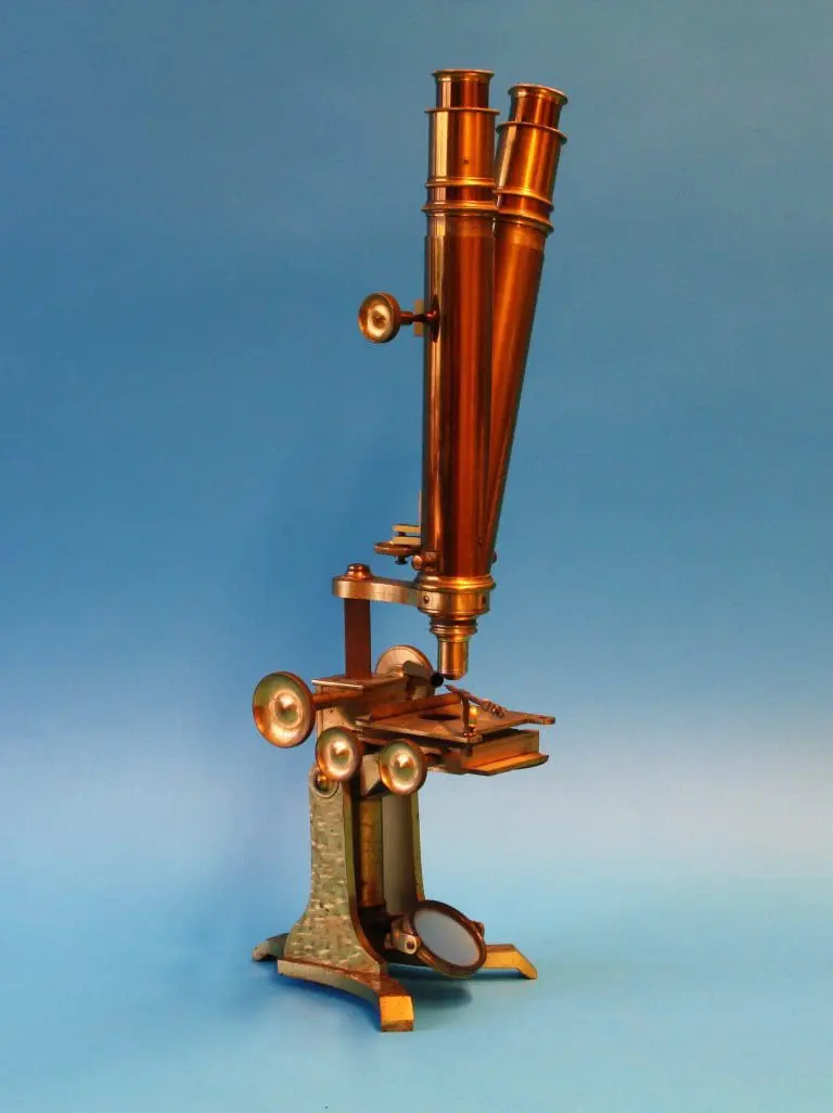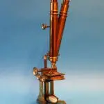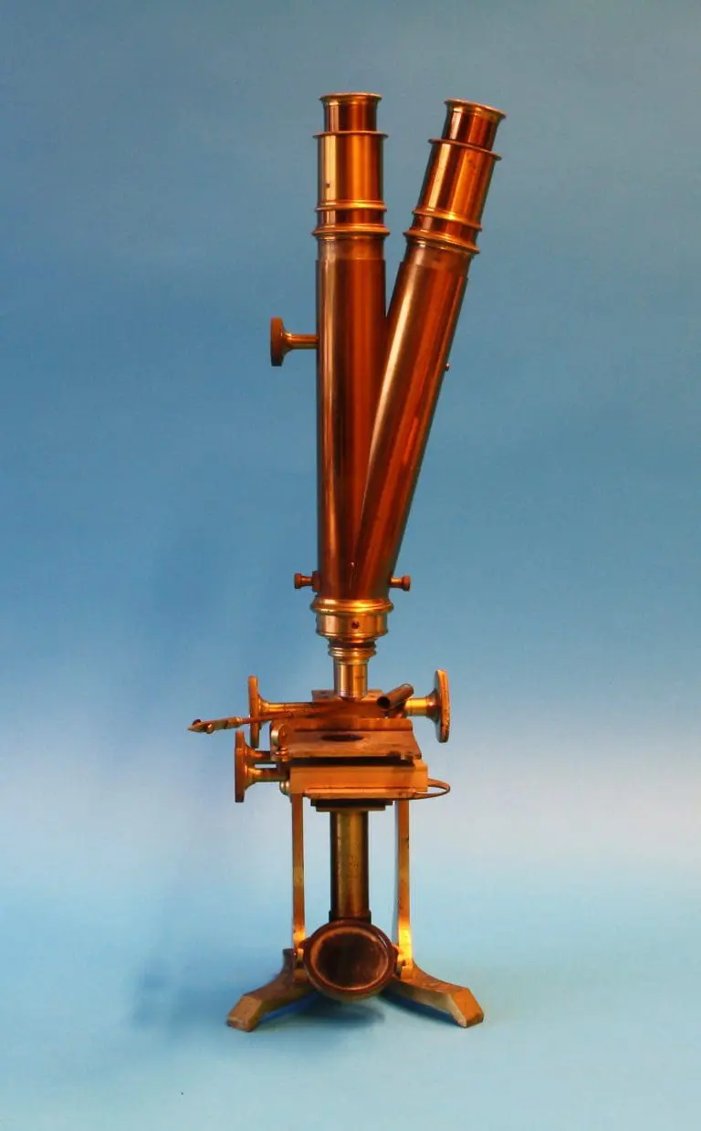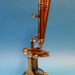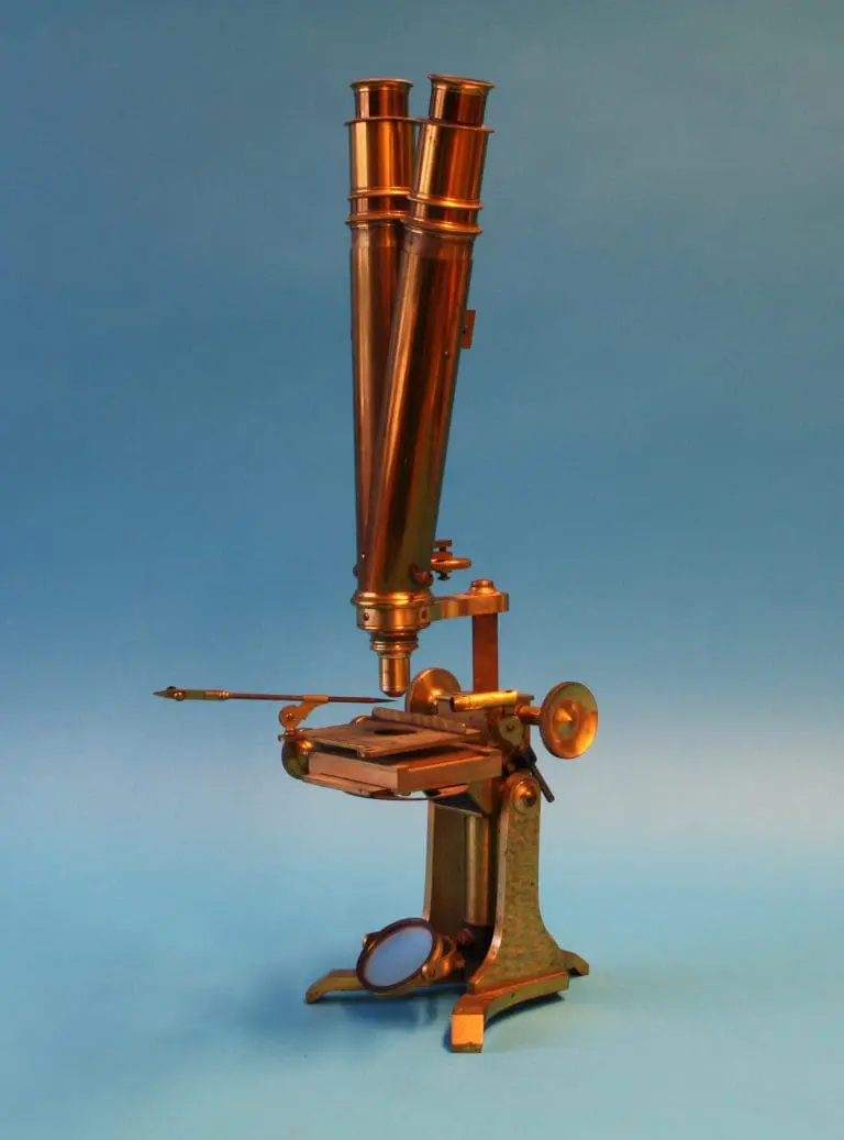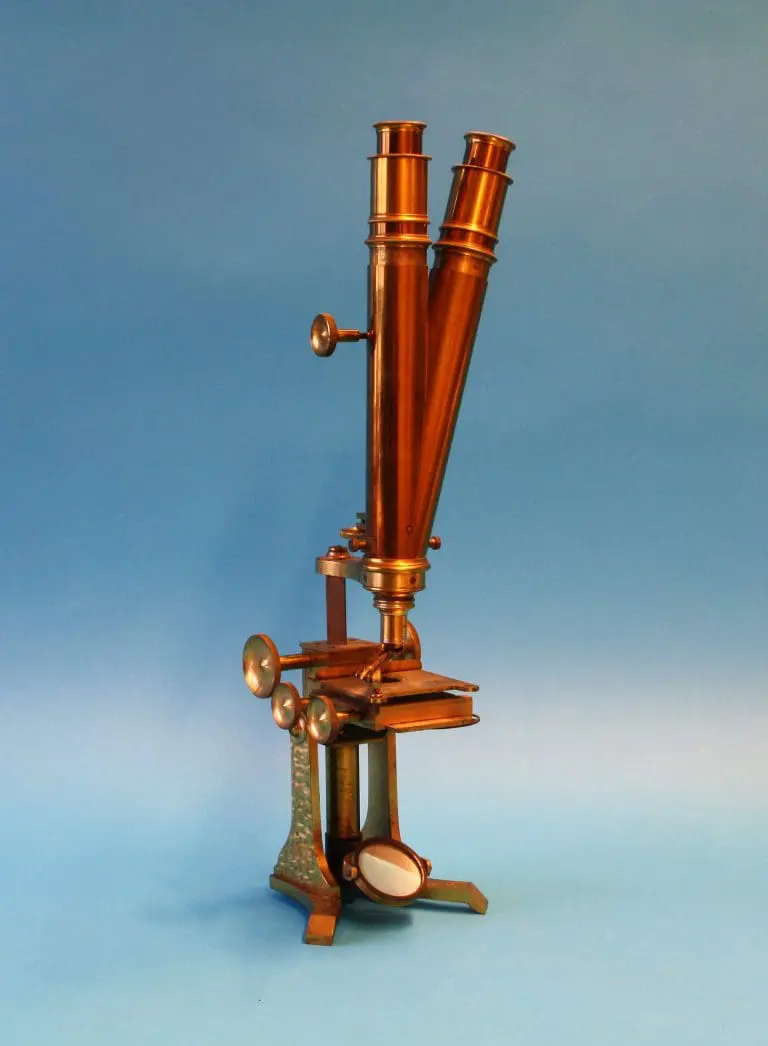 Dit microscoopstatief is een ‘bar-limb microscope with Y shaped claw foot’, zoals het door Ross vanaf 1843 gemaakt werd. Het was de hele tweede helft van de negentiende eeuw populair in Engeland, tot het aan het eind van de negentiende eeuw vervangen werd door de compactere modellen van Leitz en Zeiss, met hun korte (17-16 cm) tubus. De Engelse microscopen hadden meestal een tubuslengte van 25 cm.