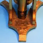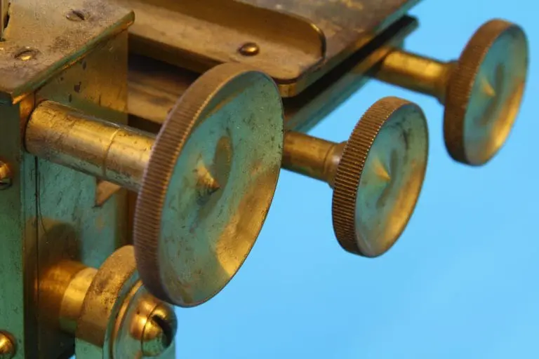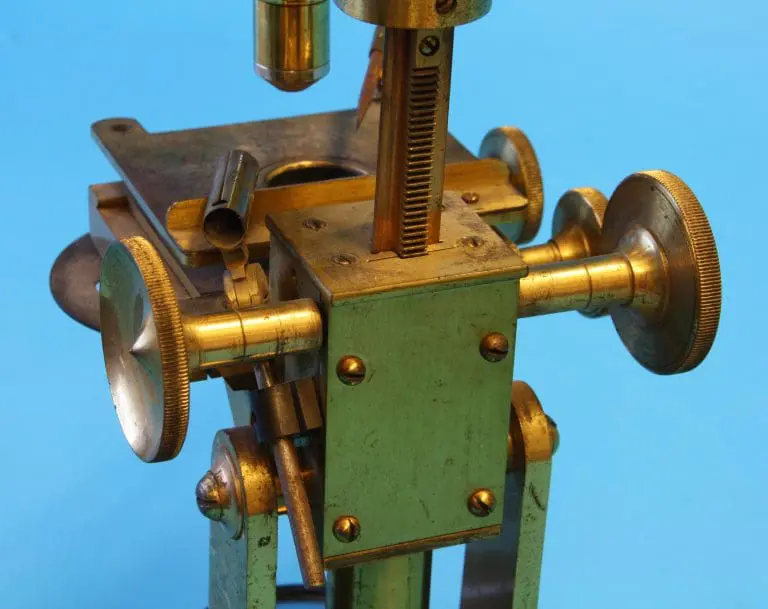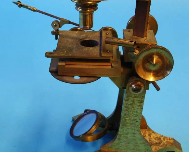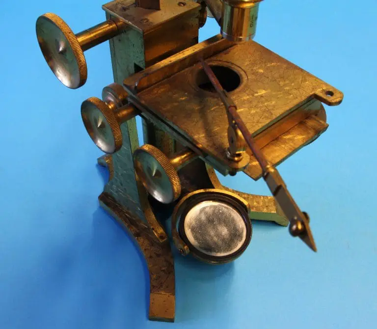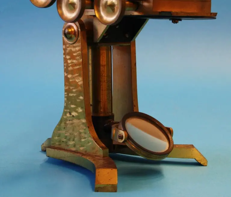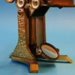 Op de Y-vormige voet zijn twee flenzen gemonteerd waar de stam van het microscoop tussen kan kantelen. Onderaan de stam de spiegel, deze is in hoogte verschuifbaar en kantelbaar in een beugel. De kleine vierkante tafel heeft een preparaatgeleiding met twee knoppen aan de rechterkant voor de X- en de Y-beweging. Links en rechts aan de voorkant zijn er gaten voor een verlichtingslens en een preparaatklemmetje.