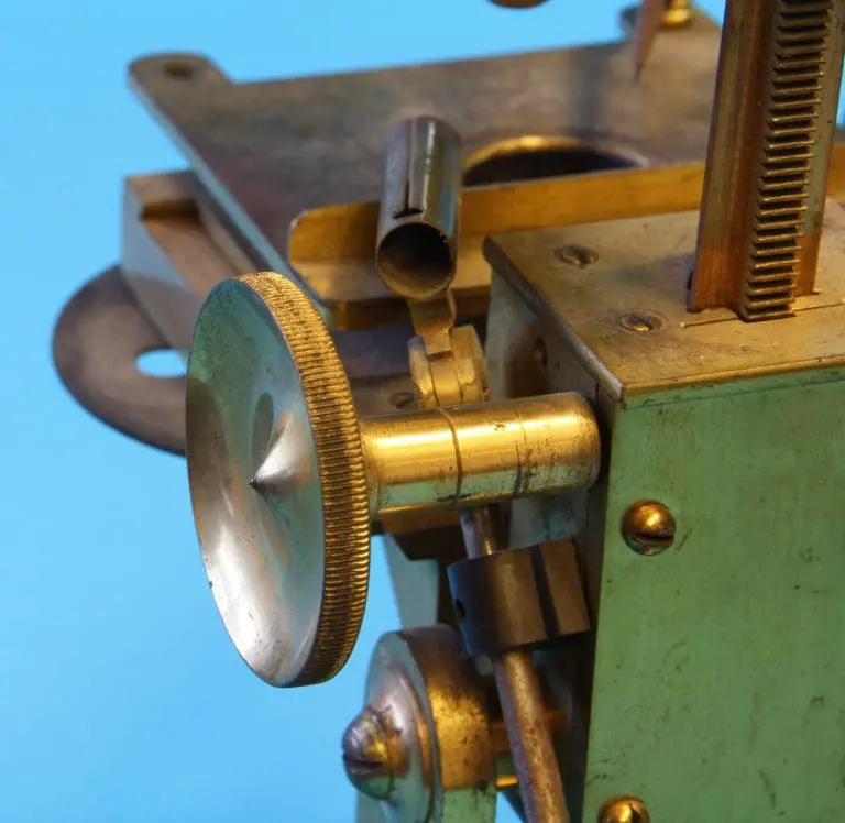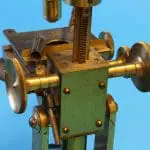 Op de tafel het blok met een rondsel en de twee knoppen voor de grofscherpstelling. De prismatische zuil draagt de tubusdrager. De tubus is voorzien van een fijnscherpstelling die via een hefboompje op de objectiefvatting werkt.