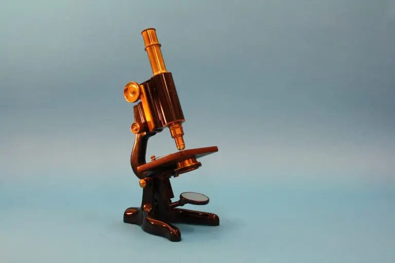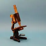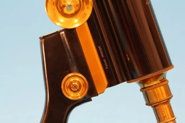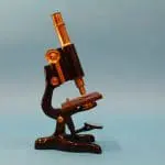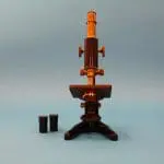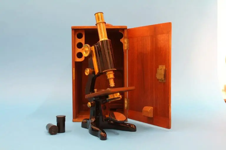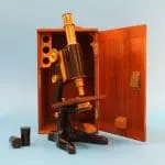 Het microscoop bevindt zich in een originele houten kist met slot en handgreep.