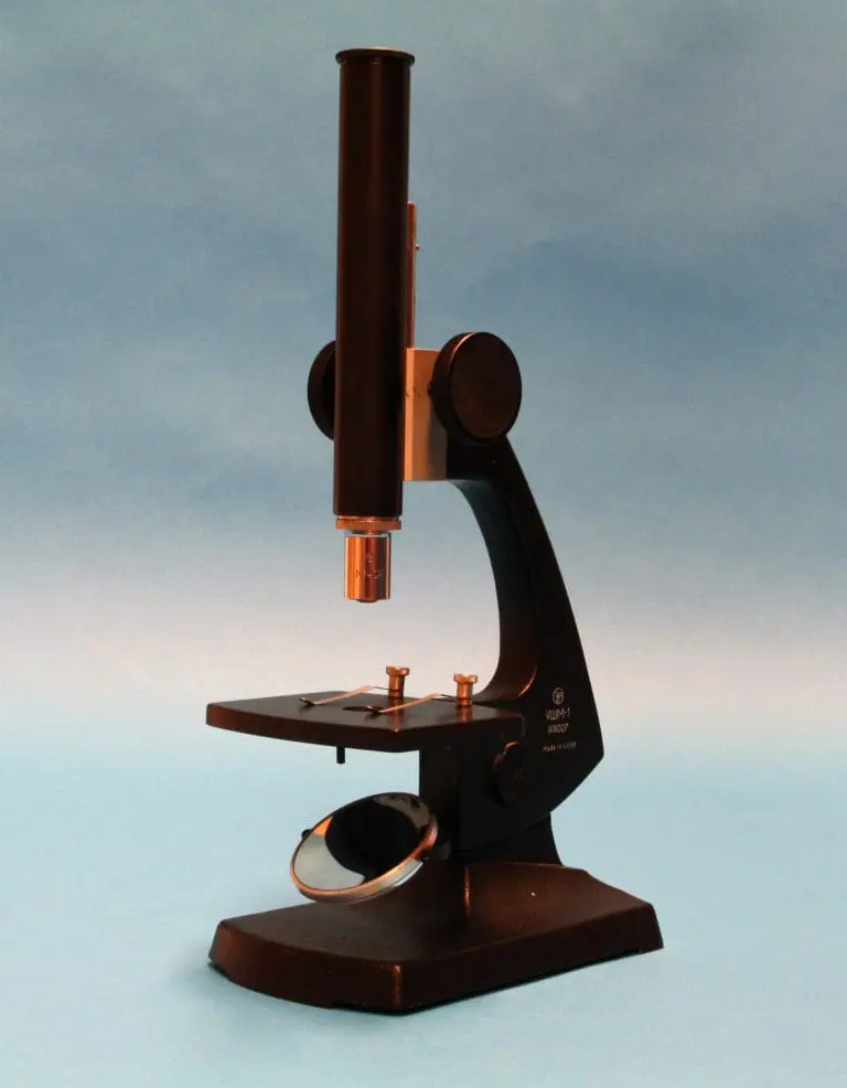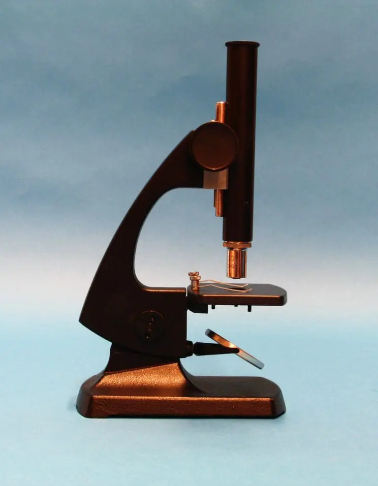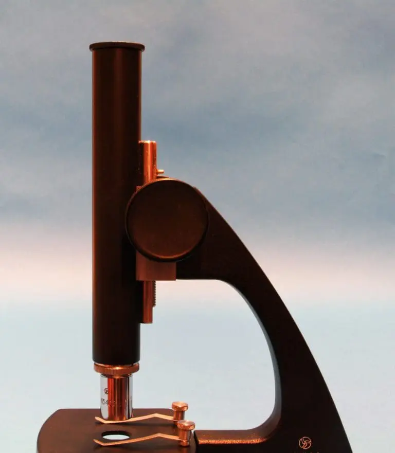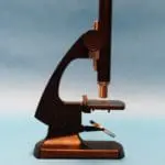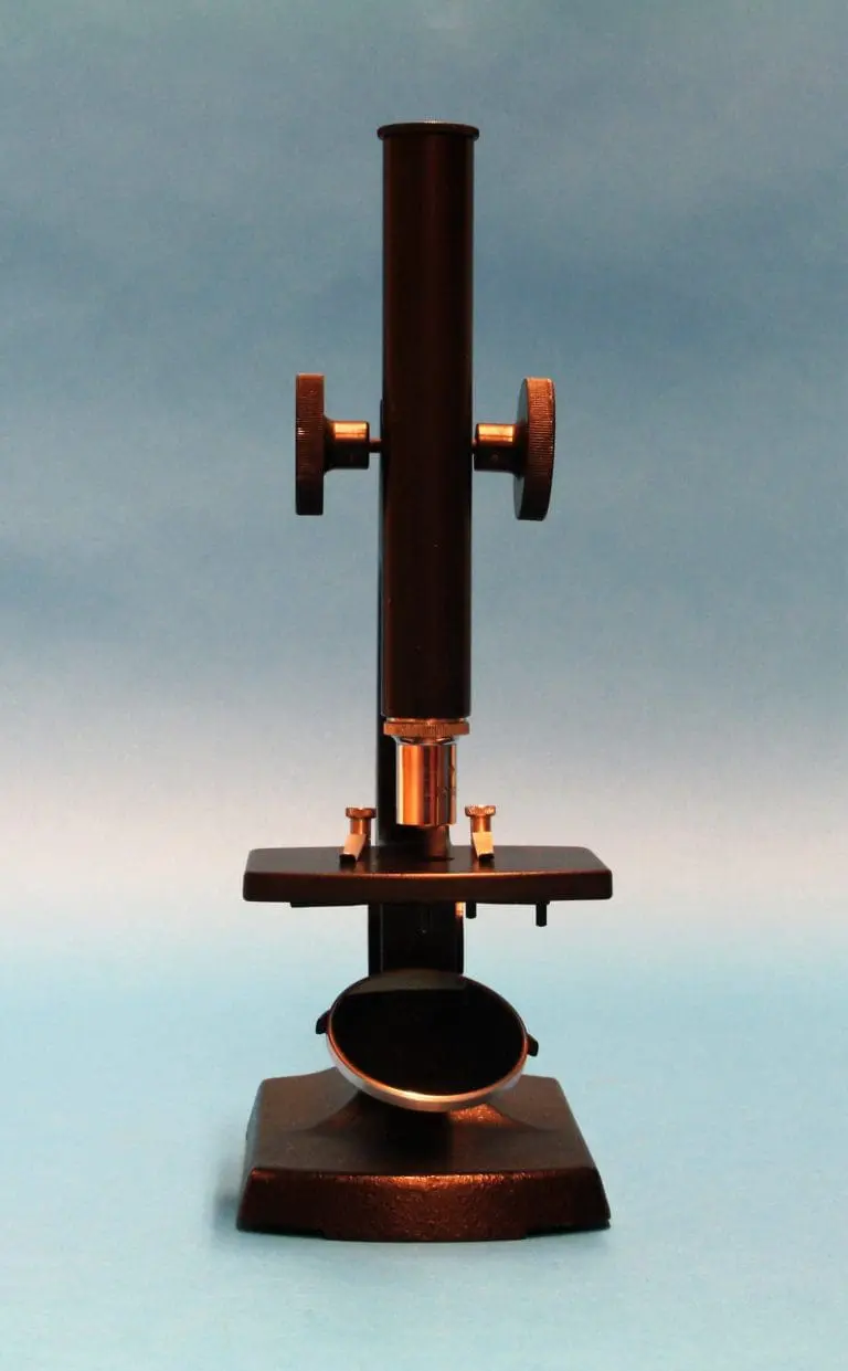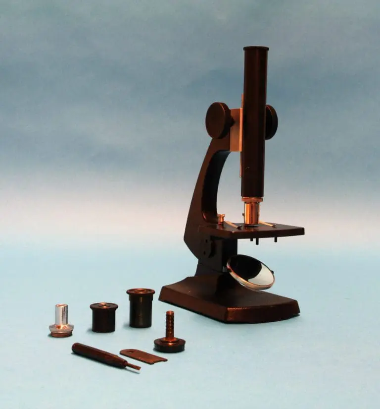 In multiplex kist met metalen handgreep. ‘Junior’ type microscoop, rechthoekige gegoten voetplaat met korte opstand waaraan de statiefarm kantelbaar is bevestigd. Onder de tafel een spiegel in een beugel. Er is een eenvoudige tafel met veerclips, zonder condensor. Scherpstelling middels tandheugel en rondsel. Met twee objectieven (8×, NA 0.4 en 20×, NA 0.4) en drie oculairen (7×, 10× en 15×).