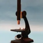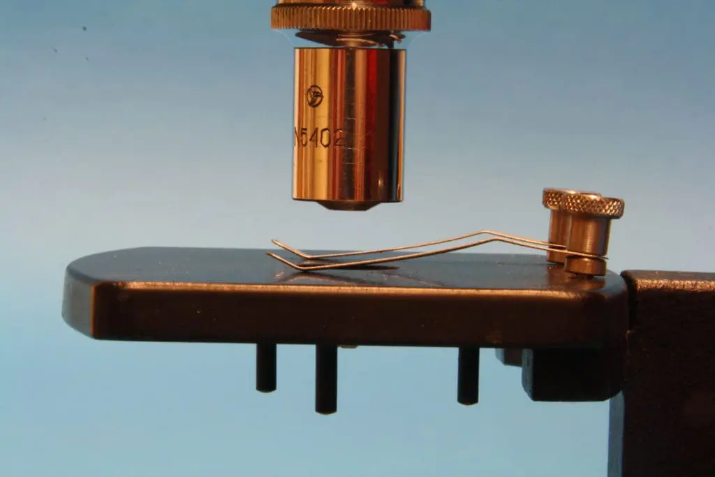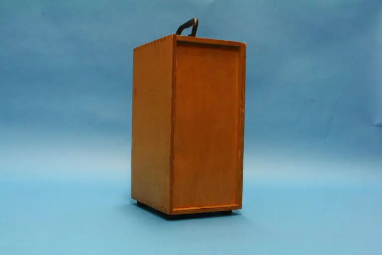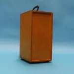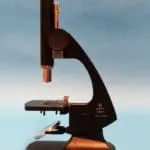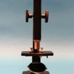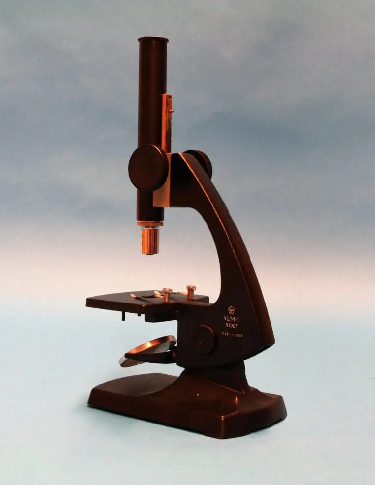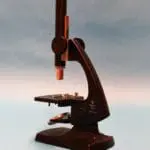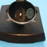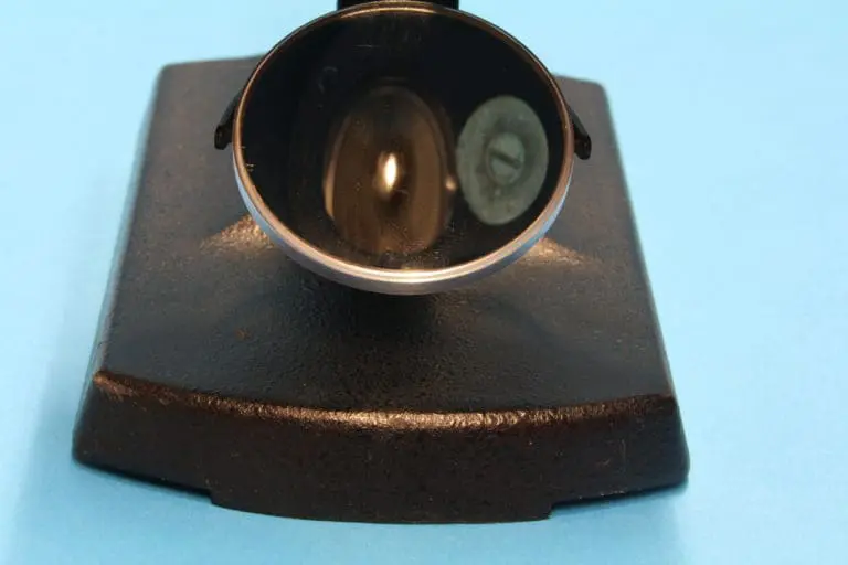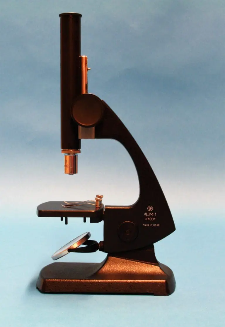 In multiplex kist met metalen handgreep. ‘Junior’ type microscoop, rechthoekige gegoten voetplaat met korte opstand waaraan de statiefarm kantelbaar is bevestigd. Onder de tafel een spiegel in een beugel. Er is een eenvoudige tafel met veerclips, zonder condensor. Scherpstelling middels tandheugel en rondsel. Met twee objectieven (8×, NA 0.4 en 20×, NA 0.4) en drie oculairen (7×, 10× en 15×).