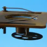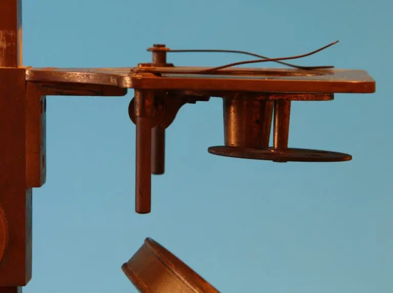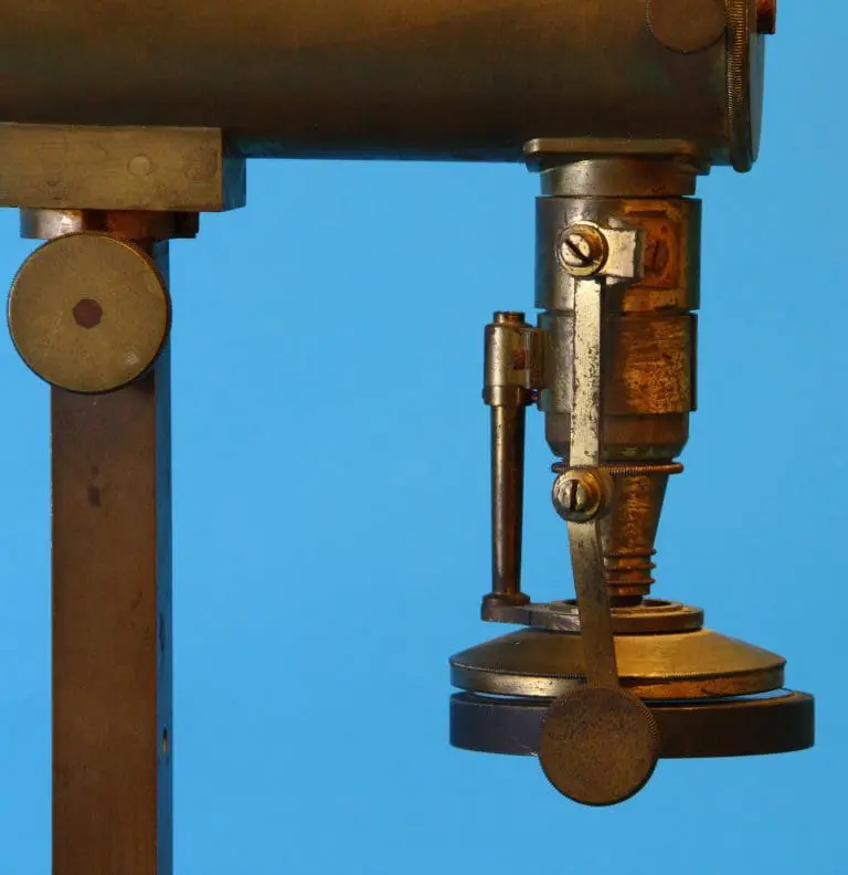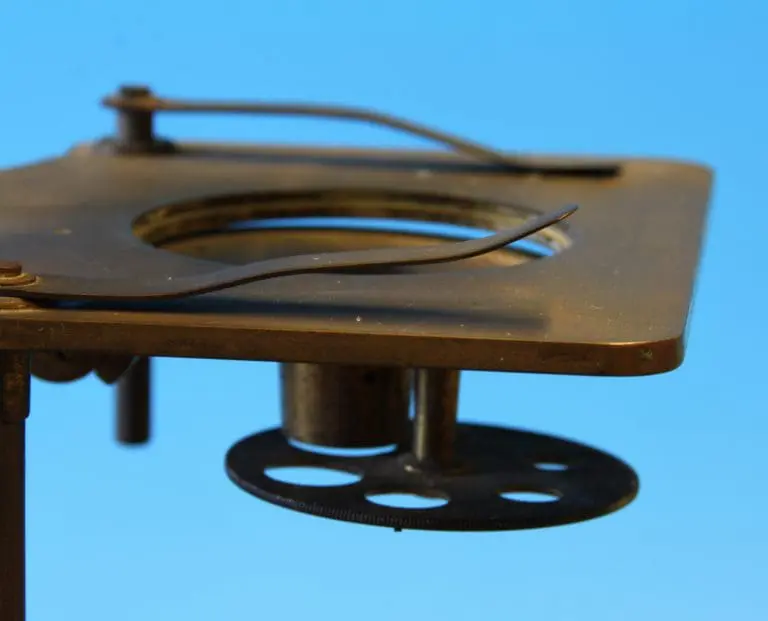 Voor gebruik wordt het instrument op de kist geschroefd. De microscoop bestaat uit een prismatische zuil die onderaan in een bus de spiegel draagt, deze is kantelbaar en draaibaar in een beugel. De tafel is aan een tweede bus bevestigd, voor scherpstelling kan de tafel middels een tandheugel en een rondsel op en neer bewegen. Onder de tafel een conus en een diafragmaschijf. Er zijn twee veerclips voor het preparaat.