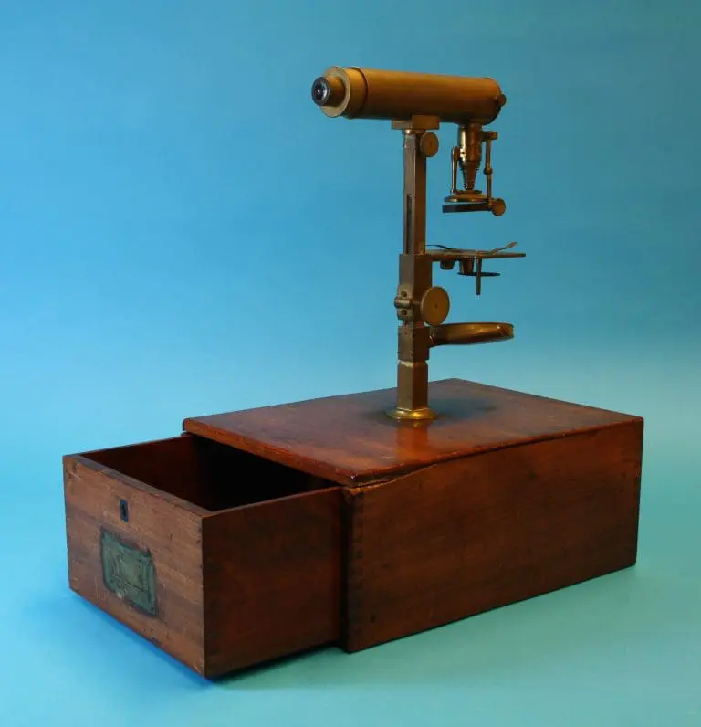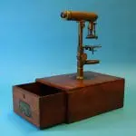 Mahoniehouten kist met lade waarin het gedemonteerde microscoop.