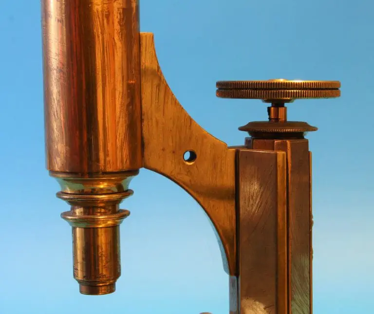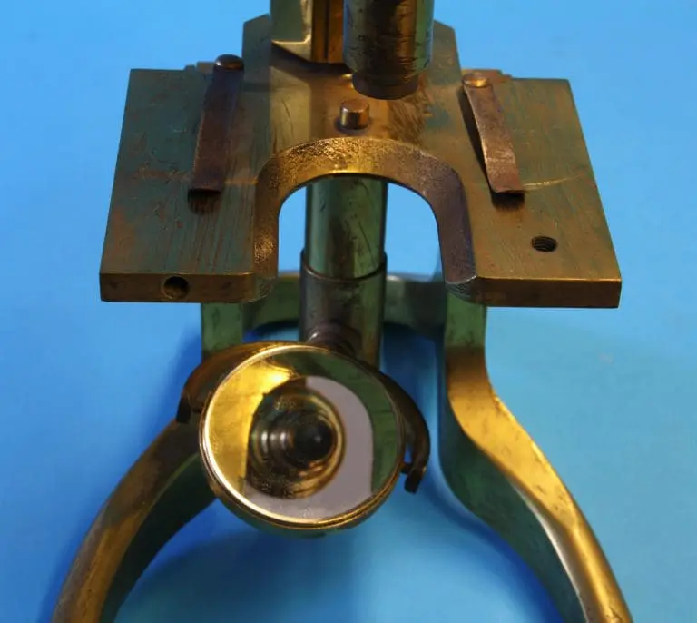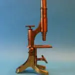 Een eenvoudig microscoop op een typisch Engelse voet die uit één stuk is gegoten. Op de onderzijde van de voet nog een ‘H’ en een ‘Y’, mogelijk een gietmerk. Met een korte kantelbare statiefzuil, met tafel. Onder de tafel een ronde zuil met bus, deze draagt de spiegel, kantelbaar in een beugel. De tafel heeft twee veerclips en een grote uitsparing waar waarschijnlijk een condensor in hoort, deze is niet meer aanwezig.