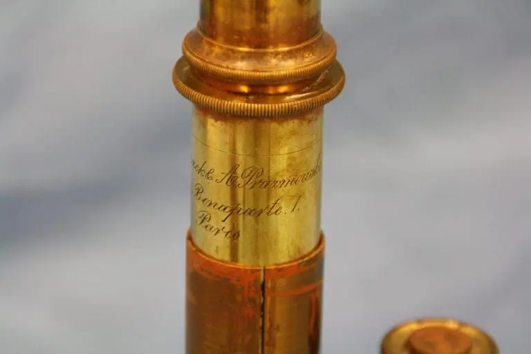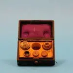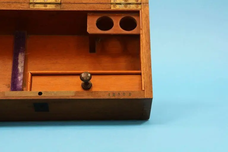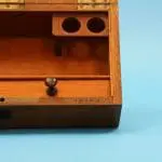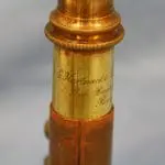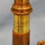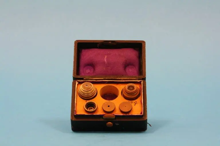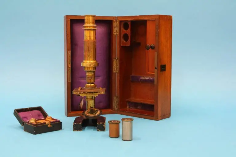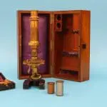 Het microscoop bevindt zich in de originele mahoniehouten kist, het deksel is van binnen met paarse zijde bekleed.