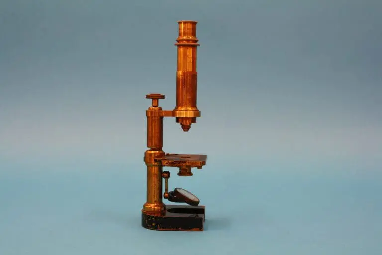 Het microscoop heeft een zwart gelakte hoefijzervormige voet van met lood verzwaard messing. De onderzijde van de voet is met leer afgeplakt. Op de voet een ronde messing zuil waaraan de tafel is bevestigd. Er zijn twee veerklemmen. Onder de tafel een vlakke en holle spiegel, kantelbaar in een beugel en uit de optische as te verplaatsen. Er is een houder voor diafragmadoppen, deze zit in een slede met zwaluwstaart onder de tafel. Op de tafel een prismatische zuil met een fijninstelling met een micrometerschroef. De grofinstelling vindt plaats door middel van een schuiftubus.