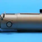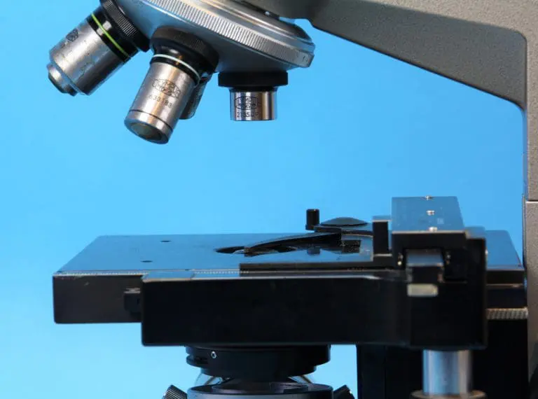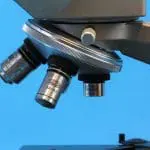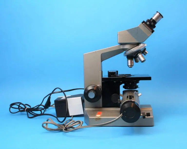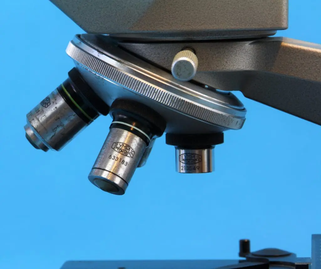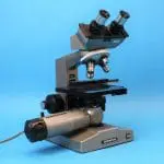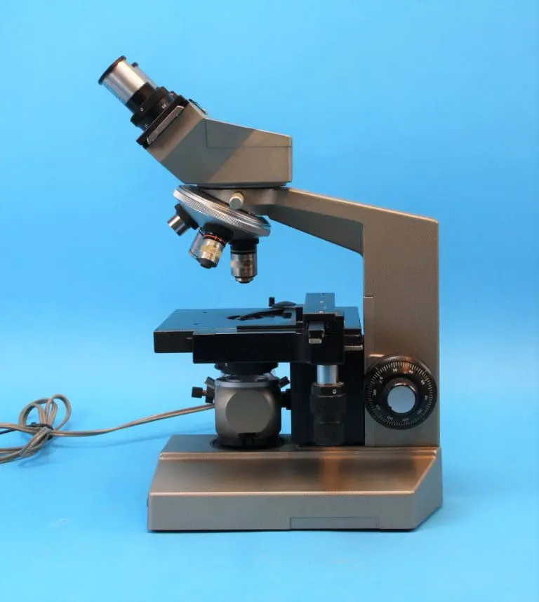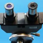 Onder de statiefarm de viervoudige objectiefrevolver, boven de arm afneembaar via een bajonetkoppeling een binoculairopzetstuk.
