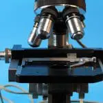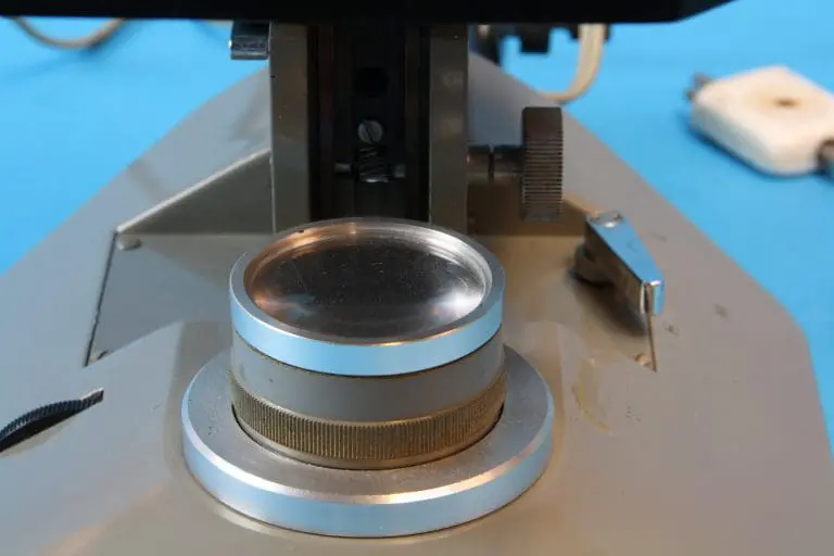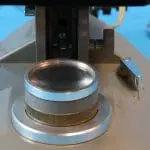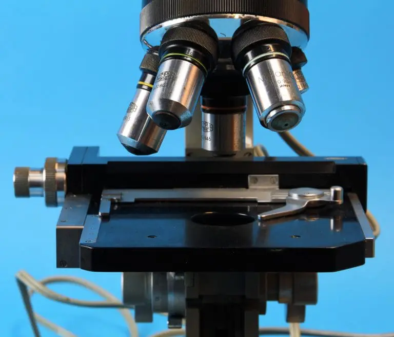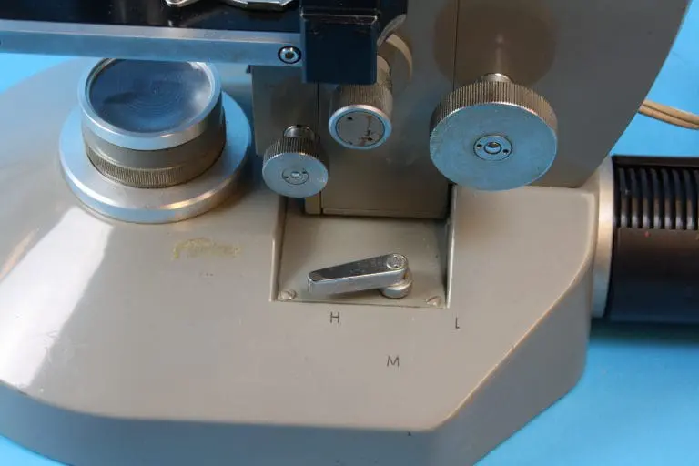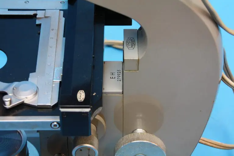 Het microscoop heeft een grote vierkante kruistafel met links de coaxiale bedieningsknoppen voor de voor-achter en links-rechts beweging.