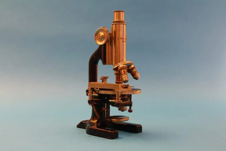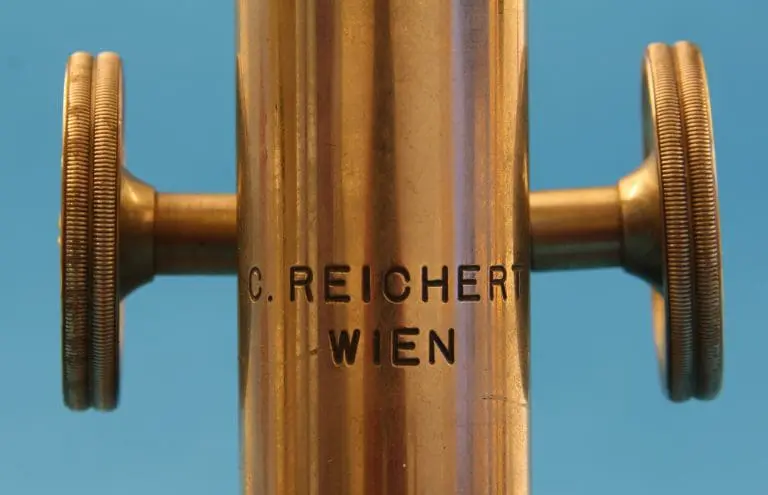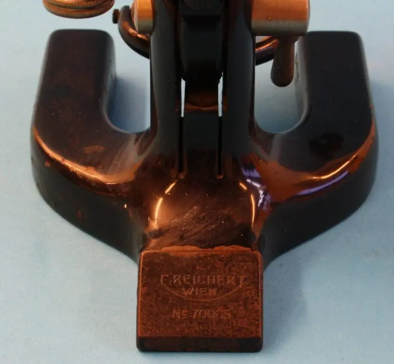 Dit is Reichert-statief type H voor gebruik door artsen en in laboratoria. Het is een eenvoudig statief, op hoefijzervoet, kantelbaar over een hoek van 90 graden. Met onder de tafel een spiegel in een beugel aan een arm zodat de spiegel uit de optische as is te verplaatsen. Met schuine verlichting zijn soms bepaalde details beter zichtbaar. Met een in hoogte verstelbare condensor. Voorzien van een ronde tafel met preparaatgeleiding. De statiefarm is zodanig gegoten dat er veel ruimte is voor grotere preparaten. Grofinstelling met tandheugel en rondsel, fijninstelling met een micrometerschroef bovenop de statiefarm. Met uitschuifbare tubus en een drievoudige objectiefrevolver. Het statief is glanzend zwart gemoffeld, vermoedelijk gietijzer. De tubus met de instelknoppen, de rand van de tafel en de preparaatgeleiding zijn van vernikkeld messing.