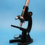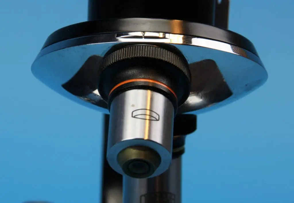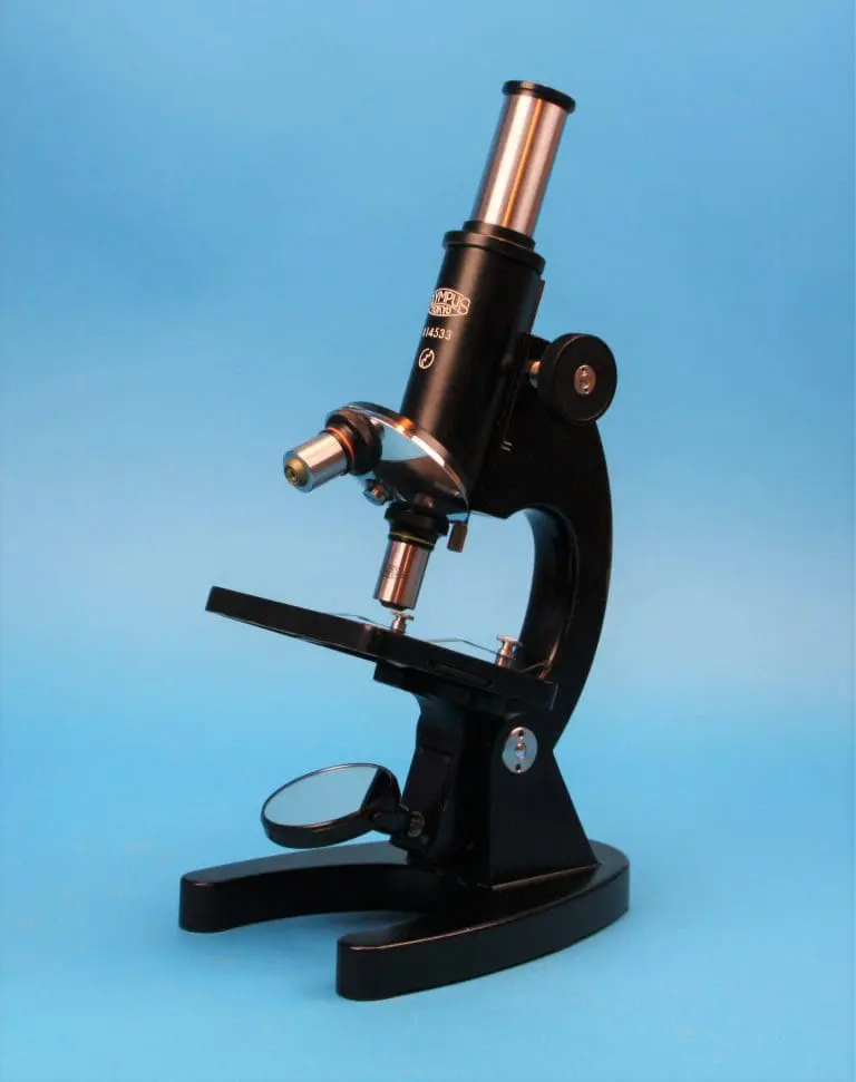 Een eenvoudig zwart gemoffeld studentenmicroscoop, het model is duidelijk gebaseerd op de Zeiss-E-statieven van rond 1935. Het microscoop heeft een hoefijzervormige voet met aangegoten flenzen waartussen het microscoop kan kantelen. Onder de tafel bevindt zich de spiegel draaibaar en kantelbaar in een beugel. Eenvoudige vierkante tafel met preparaatclips, onder de tafel een diafragmaschijf. Het microscoop heeft enkel een grofinstelling met rondsel en een tandheugel op de tubus. Er is een tweevoudige objectiefrevolver.