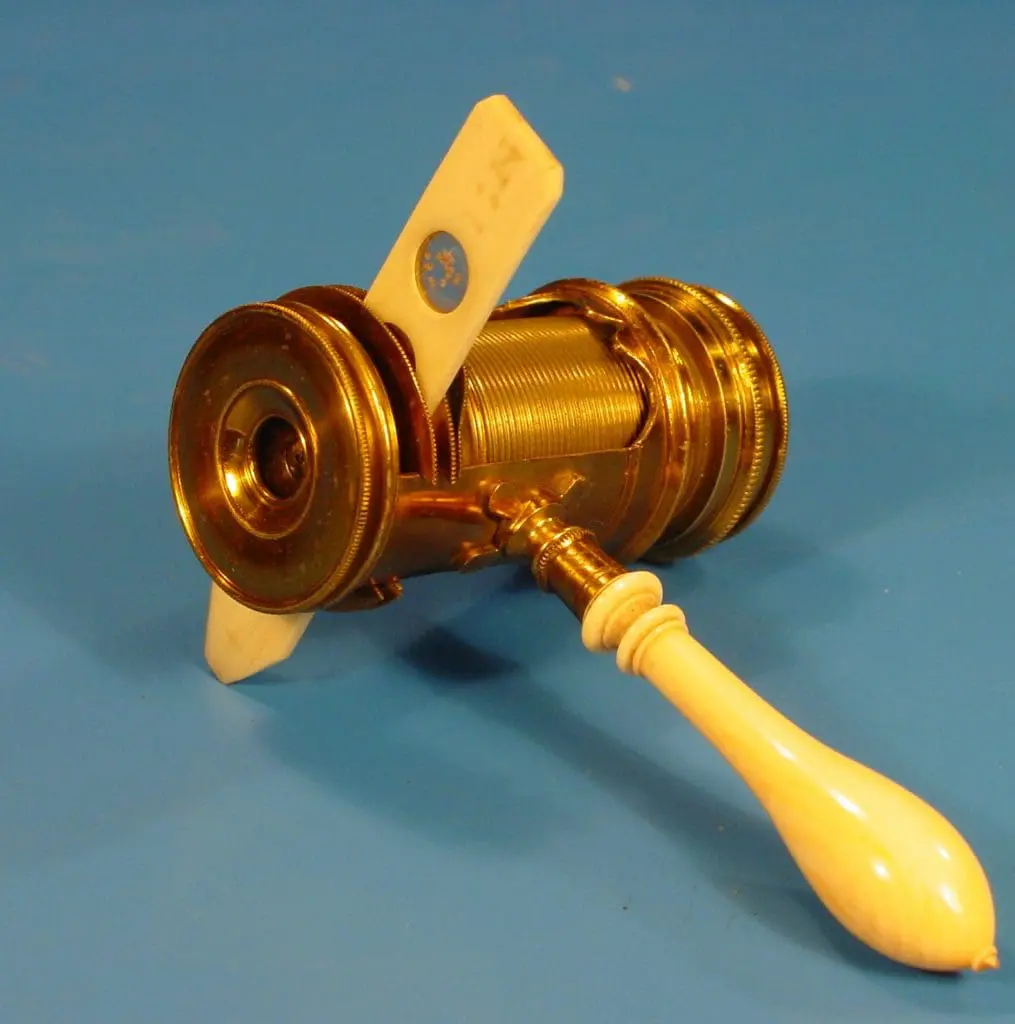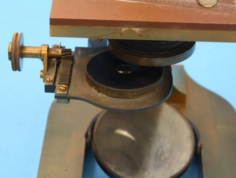 Vergelijkbaar met SM 14, dat serienummer 9197 heeft. Op een zwaar massief messing hoefijzerstatief met vlakke en holle spiegel in beugel. Er is een eenvoudige condensor zonder irisdiafragma. Hierbij een vijftal diafragmaschijven die uit de optische as zijn te verplaatsen, ze kunnen ook weggeklapt worden. Het microscoop heeft een vierkante tafel bekleed met eboniet met twee veerclips. Onder de tafel een spiegel in een beugel. Op de tafel de prismatische zuil met micrometerschroef voor de fijnbeweging. De grofbeweging werkt via een tandheugel en een rondsel.
