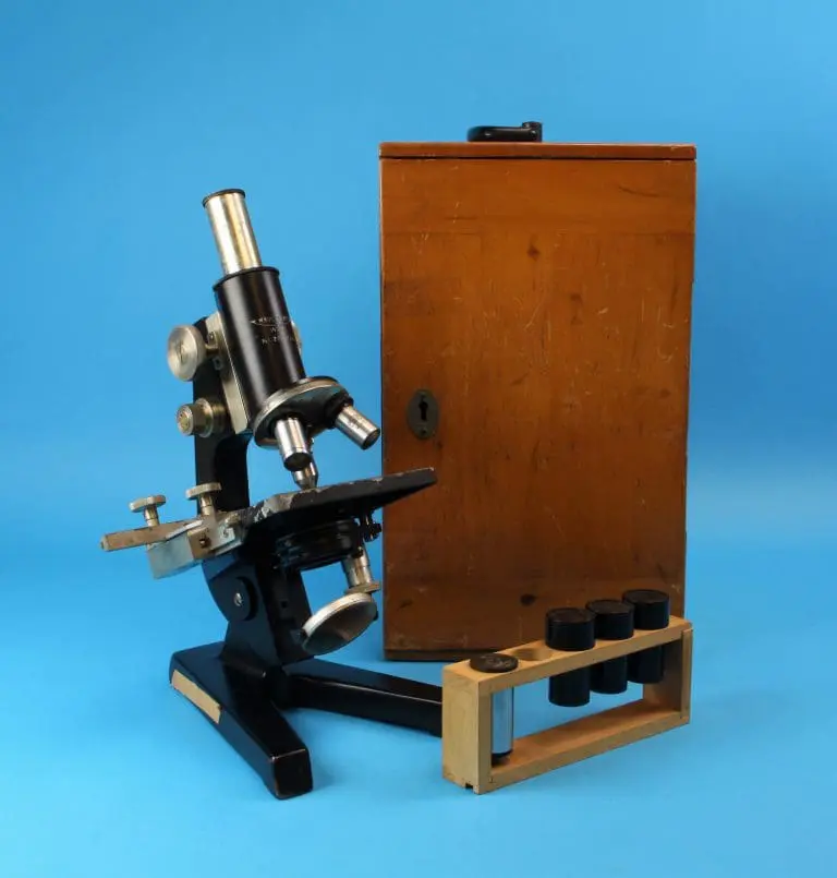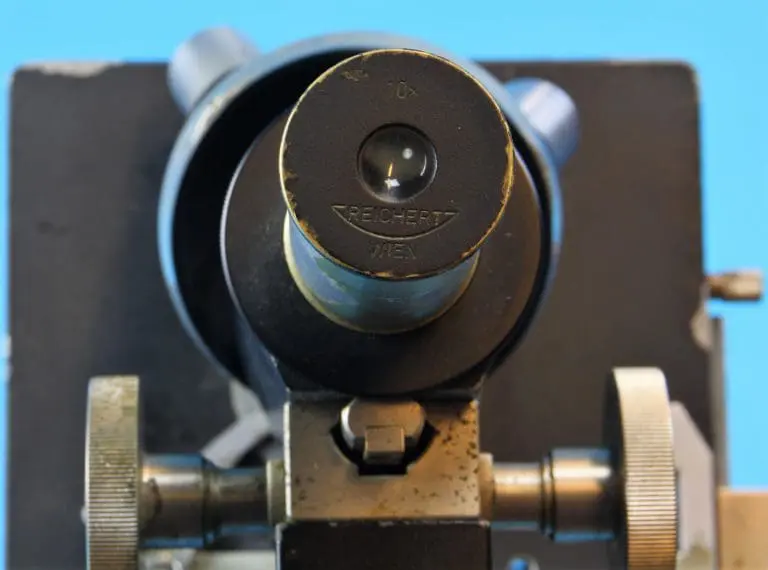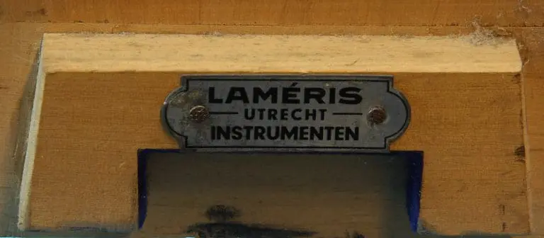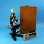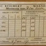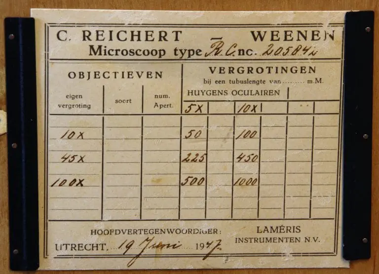 In houten kist met slot en handgreep, in de kist nog het schildje van de leverancier: Laméris / Utrecht / Instrumenten. Verder het kaartje van Reichert met de bijgeleverde objectieven en oculairen, Lameris heeft het op 19 juni 1947 gedateerd.