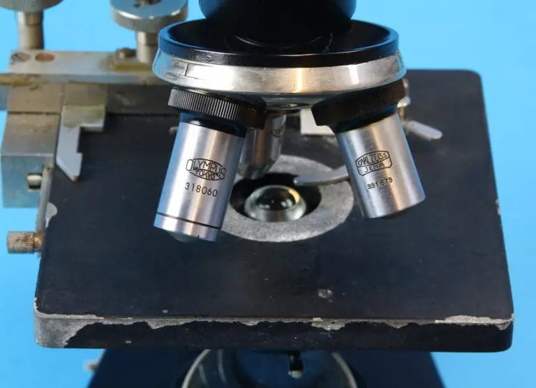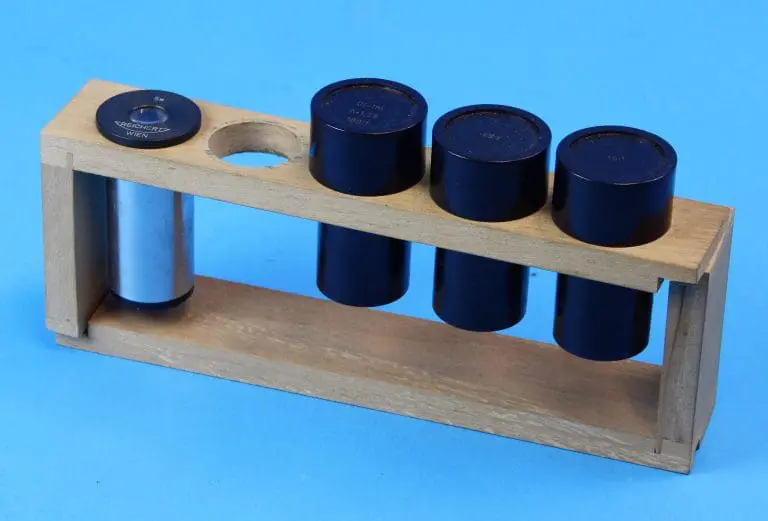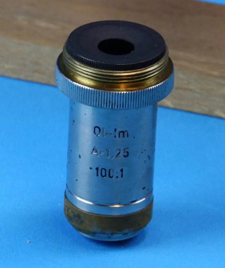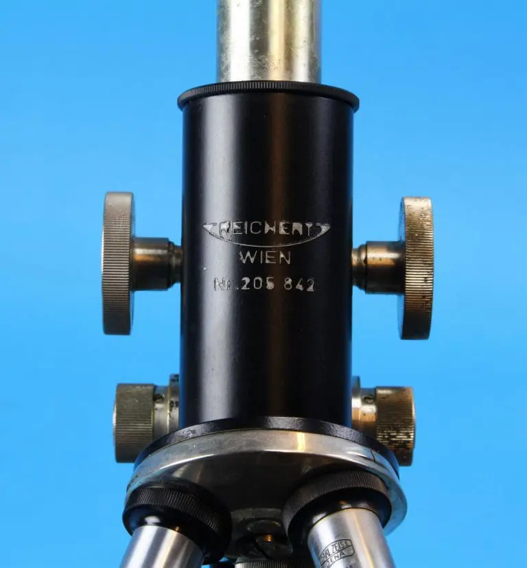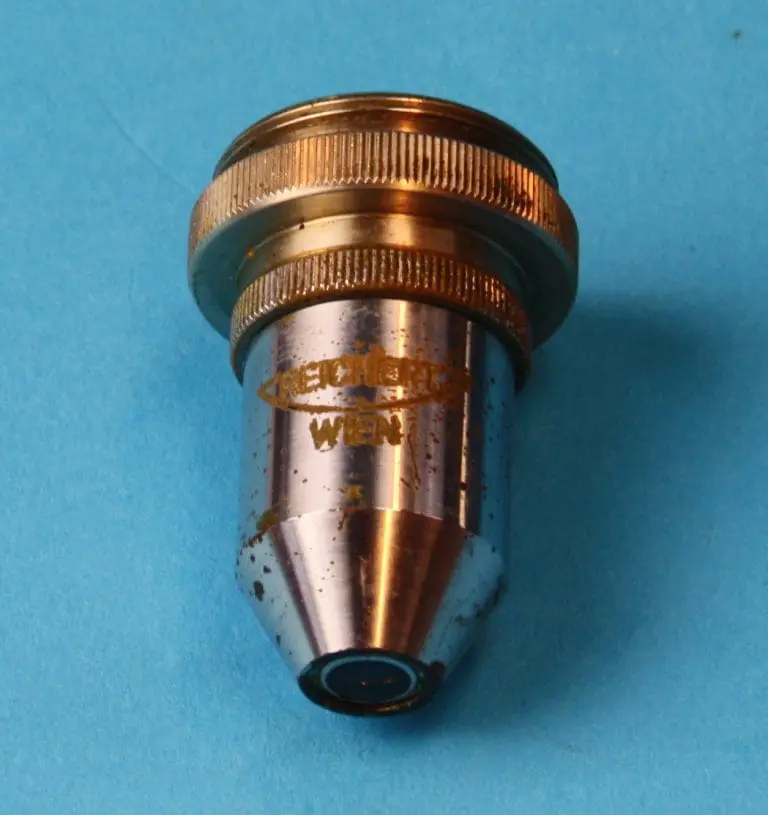 Er zijn drie objectiefhulzen C. Reichert / Wien voor de drie op het kaartje in de kist vermelde objectieven, te weten een 10:1, een 45:1 en een 100:1 Ol-Im A=1,25.
