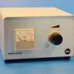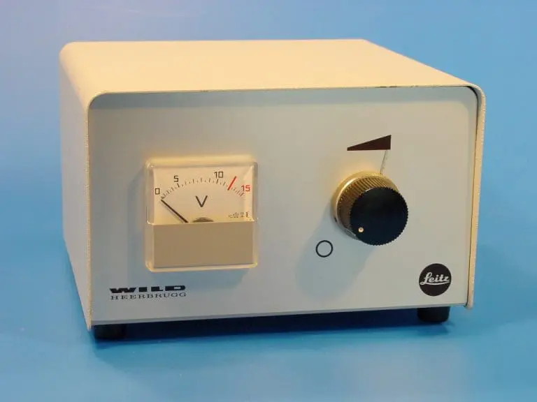 Met transformator Wild / Heerbrugg (h = 11.6 cm, b = 17.7 cm, d = 19 cm) en reservelamp.
