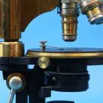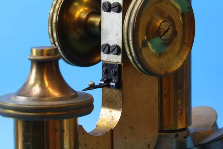 Het microscoop heeft een ronde draai- en centreerbare tafel die met eboniet is ingelegd. Met nog één veerclip.