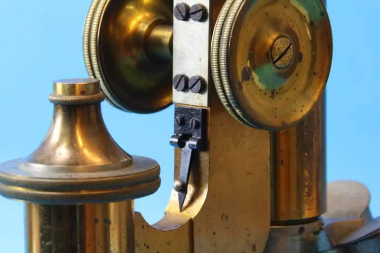 Boven de tafel een korte prismatische zuil met de fijnscherpstelling middels een micrometerschroef. Aan de tubusarm een inklapbaar aanwijspijltje voor de schaalverdeling van de instelknop.