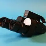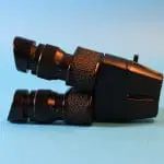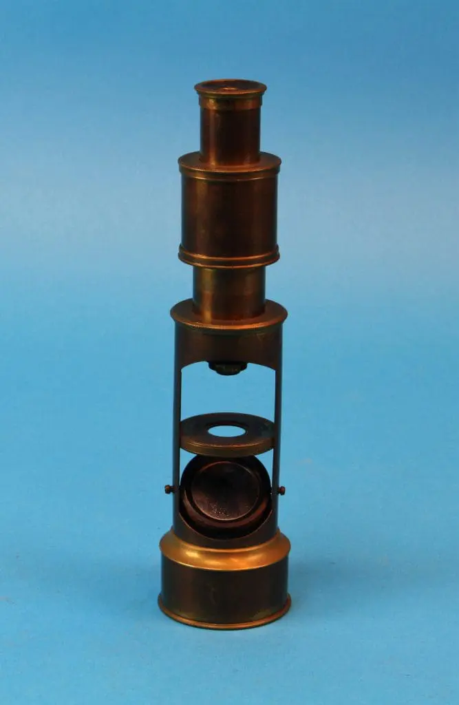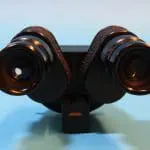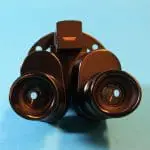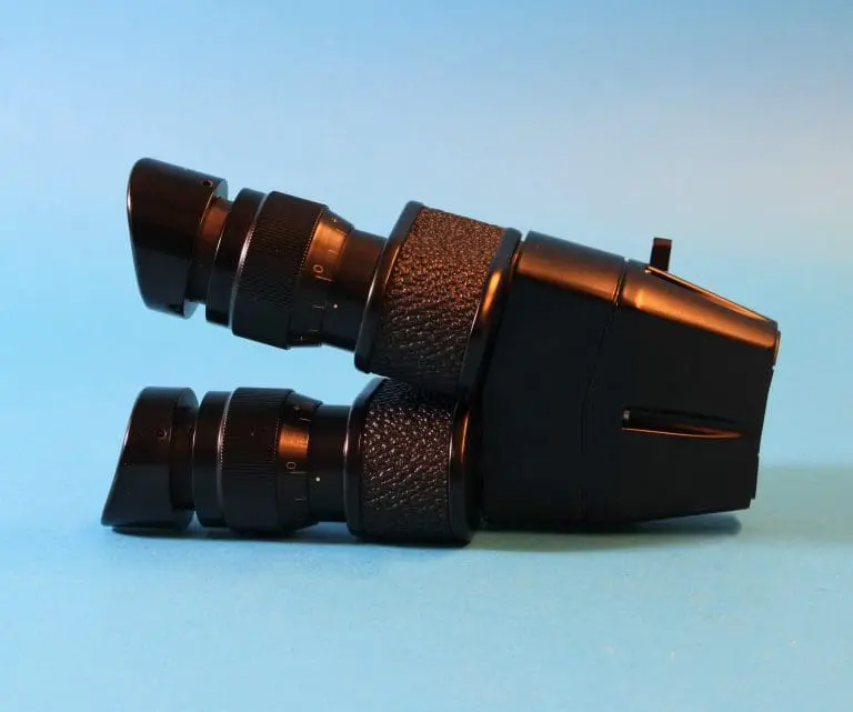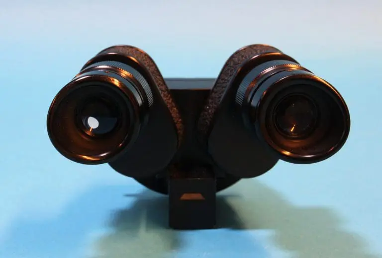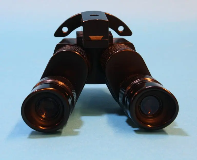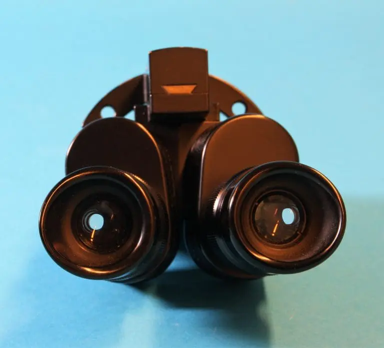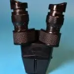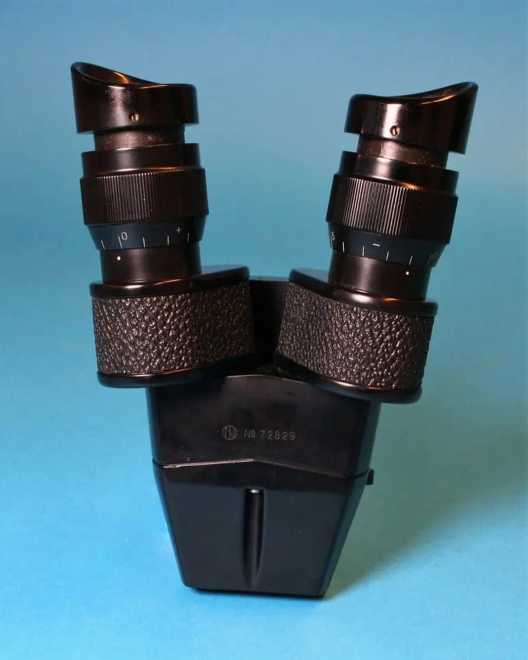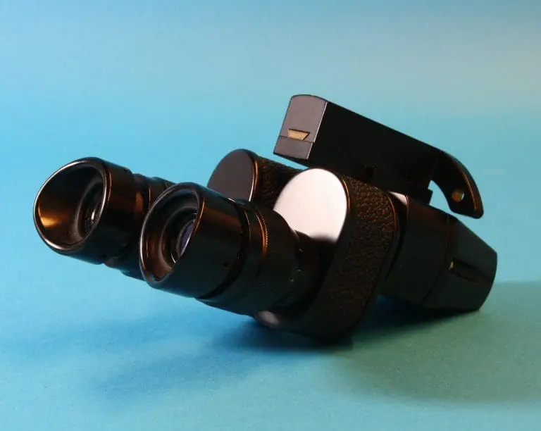 Dit is een door Bleeker / Nedoptifa vervaardigd onderdeel van de Philips EM75 elektronenmicroscoop. Het beeld op het fluorescerende scherm kan met dit instrument vergroot bekeken worden. Het is geen gewoon stereomicroscoop, maar een ‘pseudoscopisch’ microscoop. Je kunt er heel scherp mee kijken. Brandpuntsafstand ca. 8 cm.