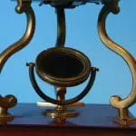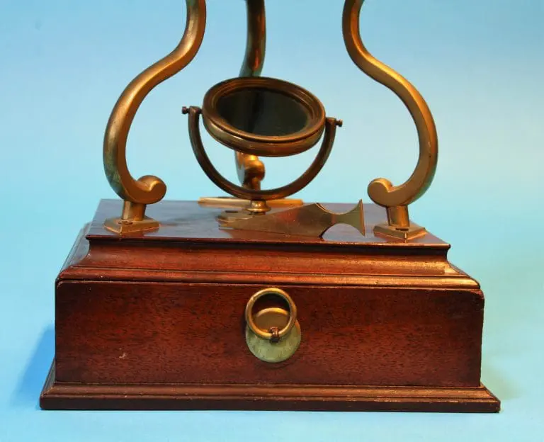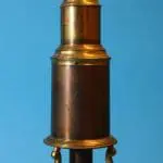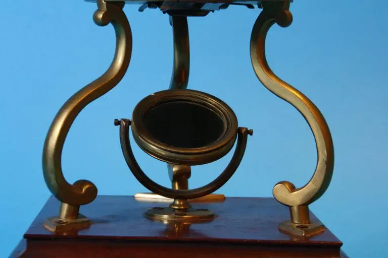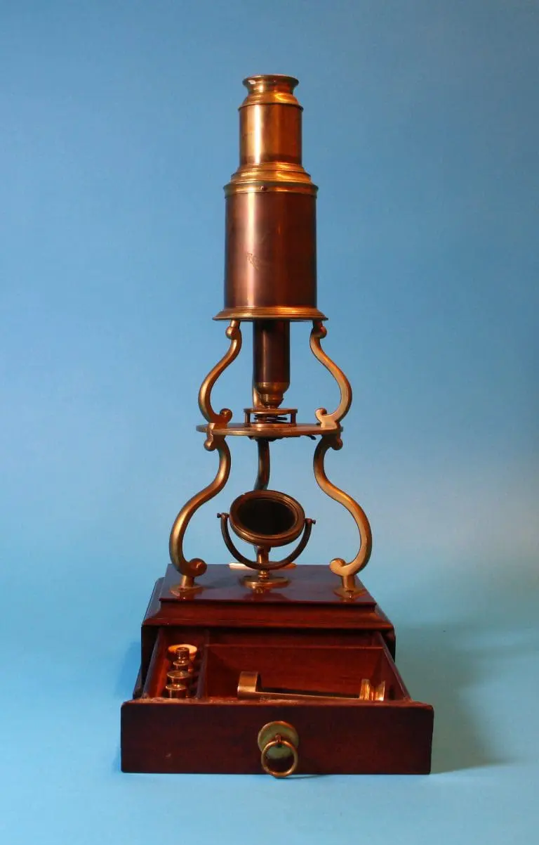 Het microscoop rust op een vierkant kistje met een laatje. Op het kistje een spiegel draaibaar in een beugel. Verder drie gekrulde gegoten messing zuilen, waartussen de tafel bevestigd is. Op de zuilen is een messing bus bevestigd waarin de eigenlijke tubus omhoog dan wel omlaag kan schuiven, hiermee stelt men scherp. De tubus bestaat bij dit type microscopen uit drie gedeelten: een onderstuk met kleinere diameter waarin het objectief schroeft, een middenstuk dat in een bus op en neer kan schuiven, en tot slot een opschroefbaar bovenstuk met het oculair.
