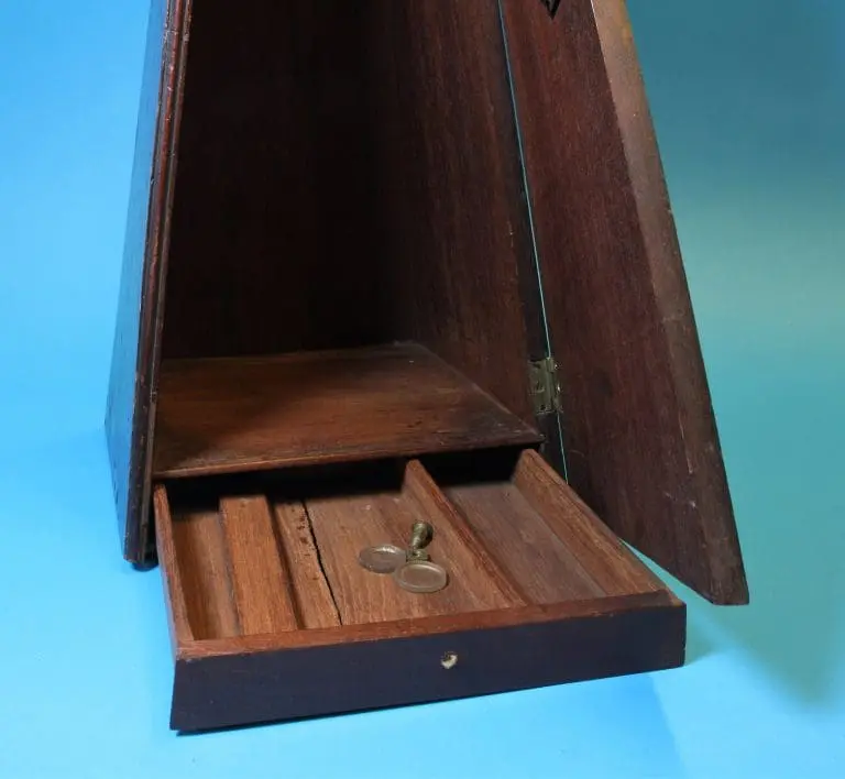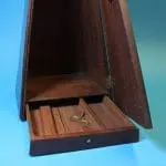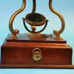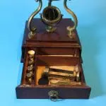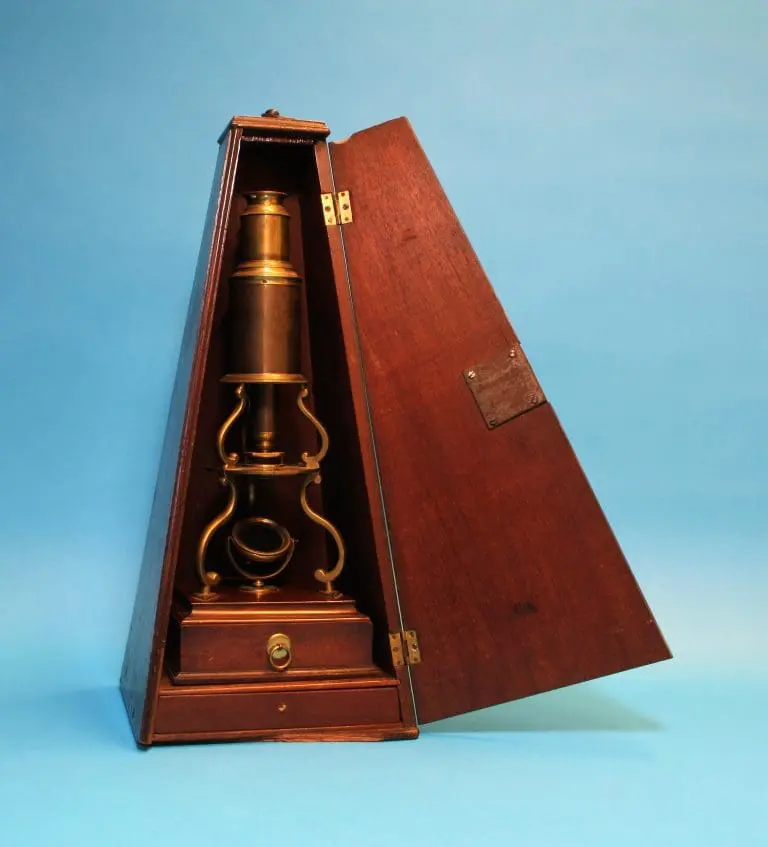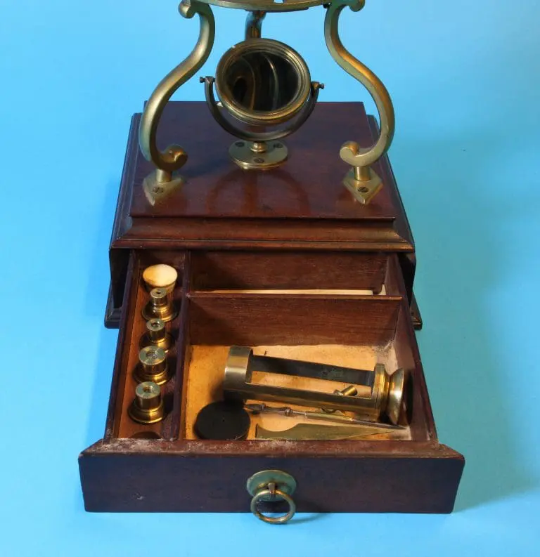 Het microscoop bevindt zich in een piramidale mahoniehouten kist met lade, slot en draagoog.
