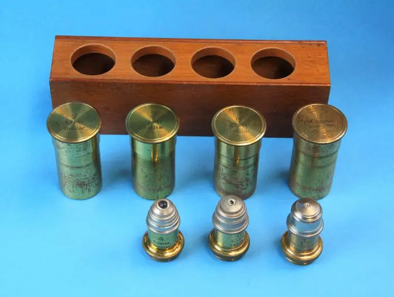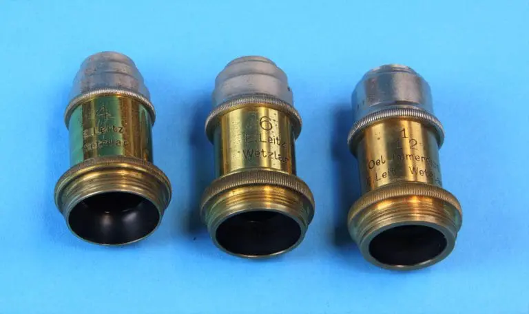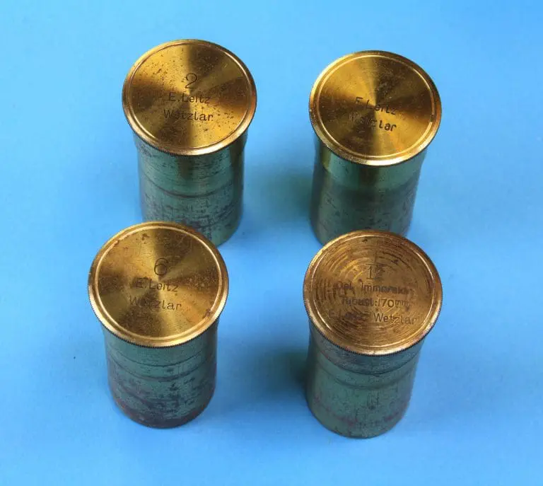 Er zijn vier objectiefhulzen gesigneerd E. Leitz Wetzlar, voor de eveneens gesigneerde objectieven ‘2’, ‘4’, ‘6’ en 1/12 ‘Oel Immersion’, NA 1.30. Alle drie de Leitz-objectieven hebben een vernikkeld front. Het hulsje van objectief ‘2’ is leeg.