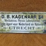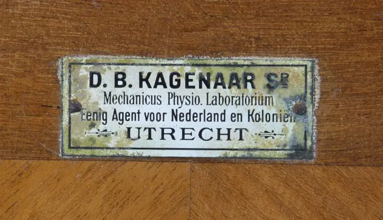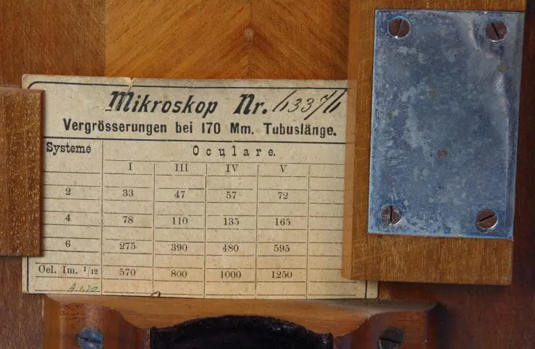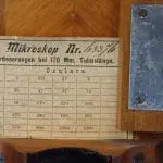De mahoniehouten kist met handgreep hoort niet bij dit microscoop, het is de kist van een Leitz-microscoop. Het kaartje in het deksel geeft een tubuslengte van 170 mm aan en vermeldt de objectieven en oculairen die nu nog aanwezig zijn. De tubuslengte van 170 mm is typerend voor Leitz-microscopen. Ook het plaatje van Kagenaar uit Utrecht duidt op een Leitz-microscoop, hij trad op als wederverkoper. Het serienummer op het kaartje is niet geheel eenduidig, vermoedelijk is het 13371, hetgeen wijst op een fabricagejaar van 1888–1889.