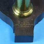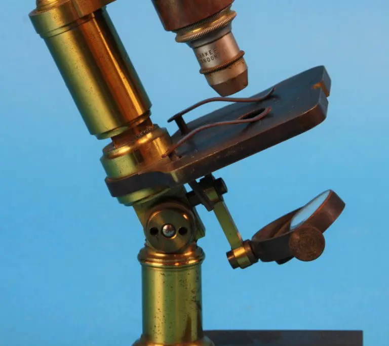 Aan het microscoop een geheel vernikkeld objectief gesigneerd C. Baker / London // ¾ inch.