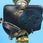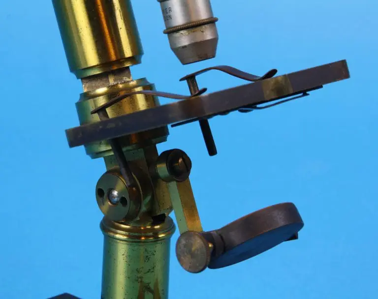 Boven de tafel een prismatische zuil met micrometerschroef voor de fijnscherpstelling. Hieraan de tubusdrager met grofscherpstelling door middel van een schuiftubus. De tubus heeft een uitschuiftubus zodat verschillende tubuslengten zijn in te stellen.