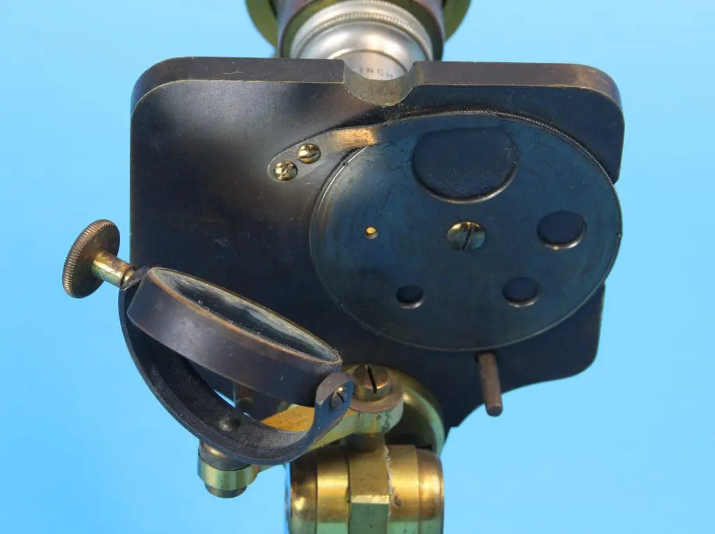 De korte arm draagt de eenvoudige vierkante messing tafel met gaten voor twee veerclips. Onder de tafel aan een korte arm de spiegel, kantelbaar en draaibaar in een beugel. De spiegel is uit de optische as te verplaatsen voor schuine belichting. Onder de tafel een diafragmaschijf met vijf gaten. Aan de voorzijde is de tafel met een ronde vijl uitgevijld, dit is naderhand gedaan, waarom is niet duidelijk.