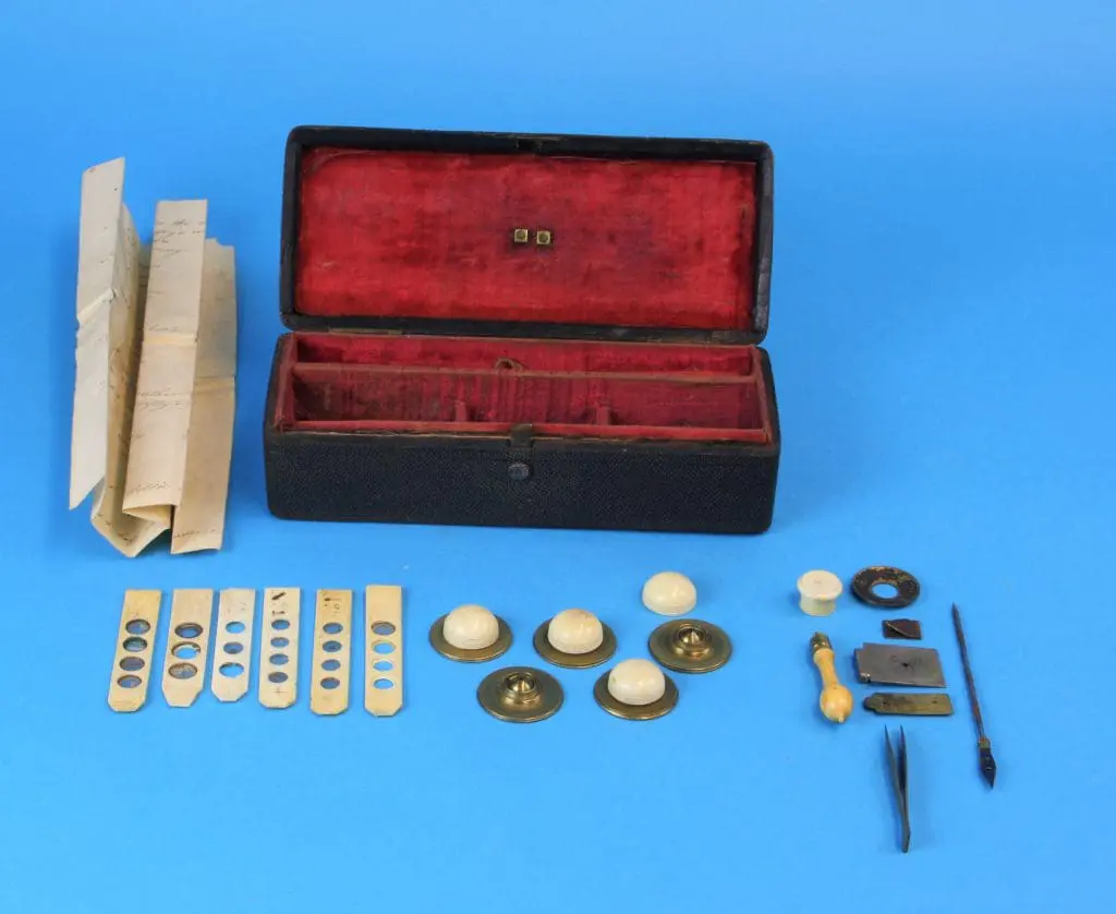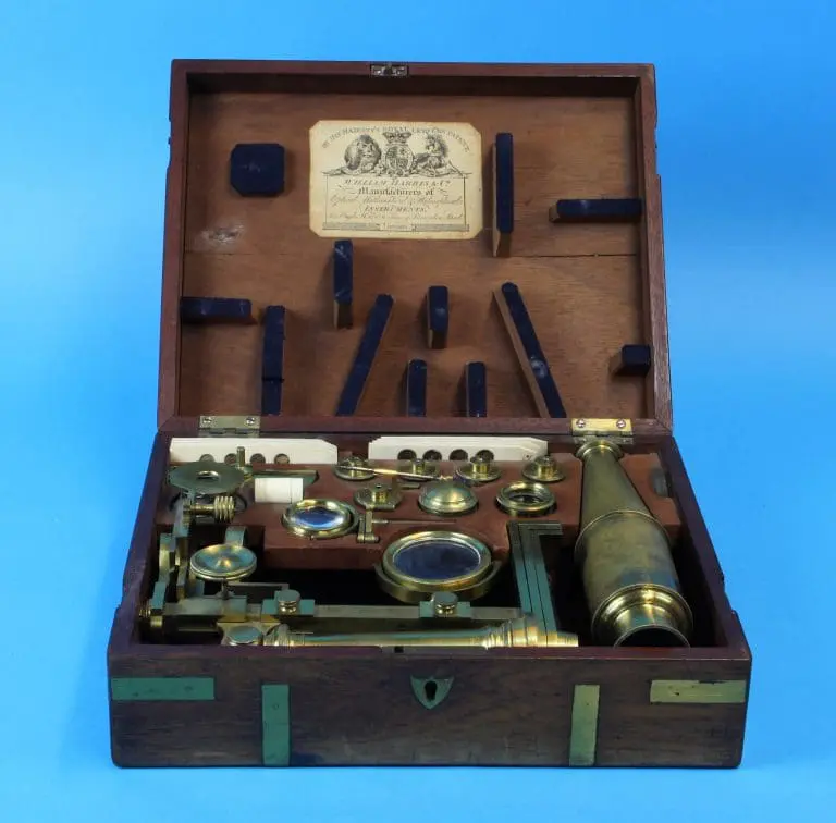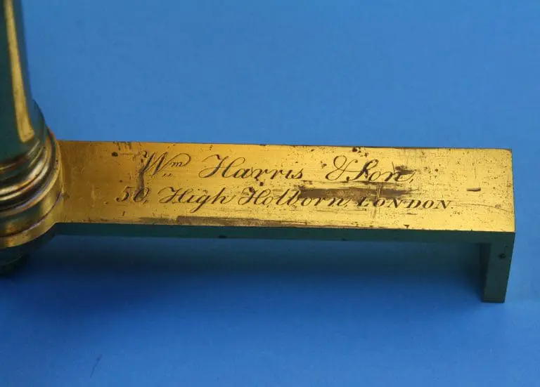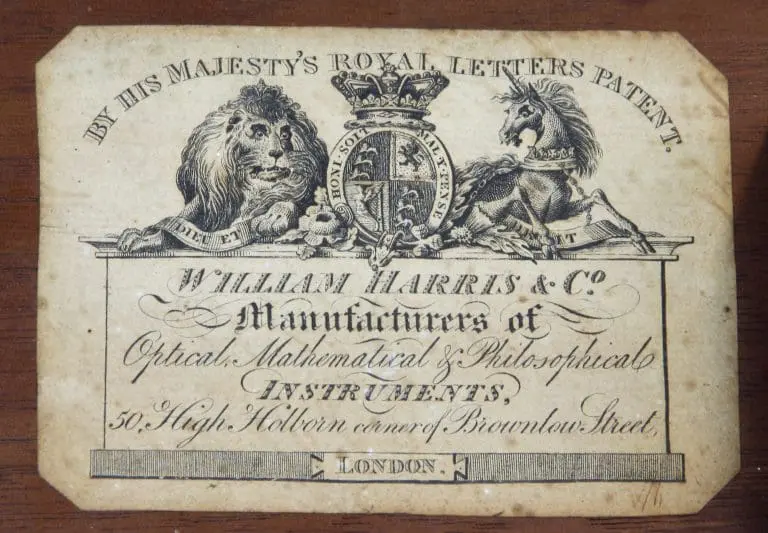 In een platte mahoniehouten kist, in de kist het etiket van Harris, op het opgegeven adres in High Holborn was William Harris werkzaam van 1816-1835.