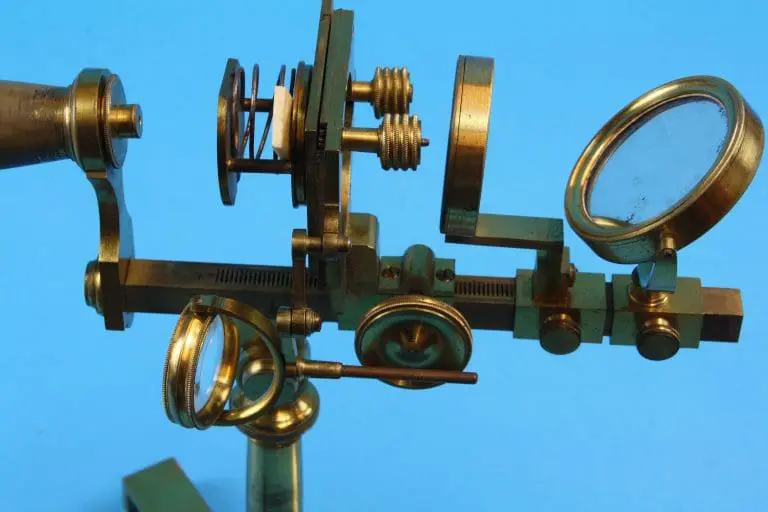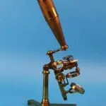 Aan de tafel een oog waarin via twee geledingen een verlichtingslens past (bull’s eye condenser).