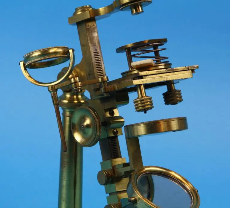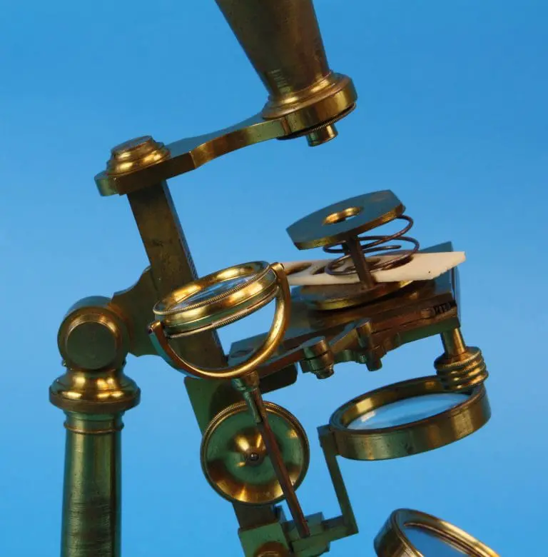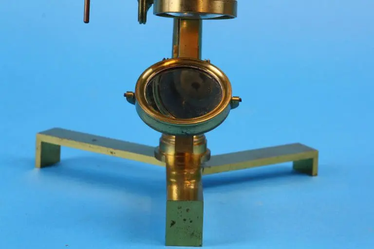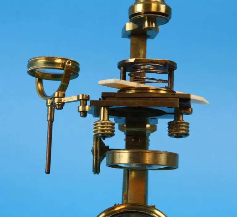Op het onderste gedeelte van de messing zuil met vierkante doorsnede bevinden zich van onder naar boven de in hoogte verstelbare spiegel (draaibaar en kantelbaar in een beugel) en onder de tafel een condensorlens, eveneens in hoogte verstelbaar. Ter hoogte van de tafel is er een tandheugel in de staaf ingelaten, middels een rondsel kan nu de tafel in een bus op en neer bewogen worden. Op de tafel een rond inzetstuk met klemveer voor de preparaten.