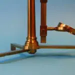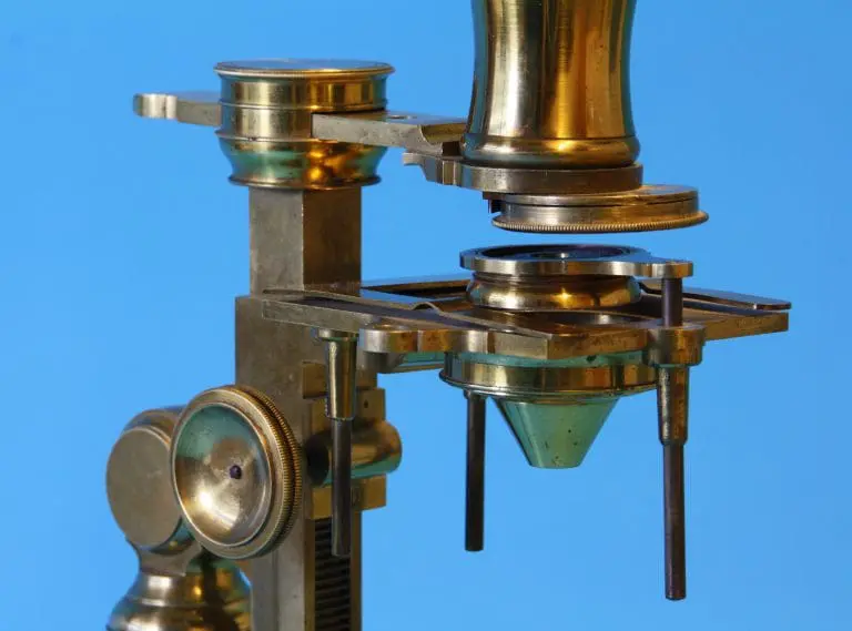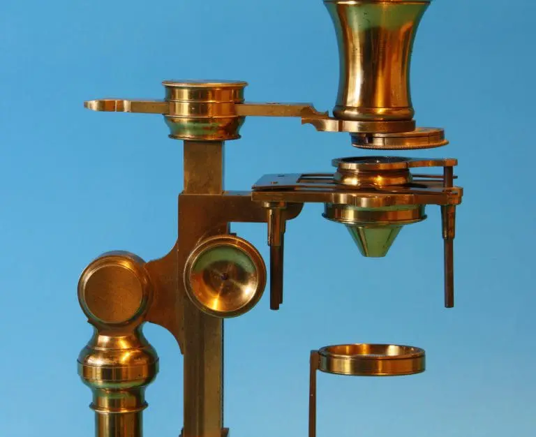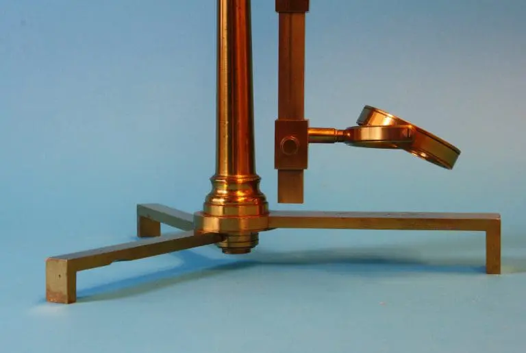 Op het onderste gedeelte van de messing zuil met vierkante doorsnede bevinden zich van onder naar boven de in hoogte verstelbare spiegel (draaibaar en kantelbaar in een beugel) en onder de tafel een condensorlens, eveneens in hoogte verstelbaar. Ter hoogte van de tafel is er een tandheugel in de staaf ingelaten, middels een rondsel kan nu deze zuil in een bus op en neer bewogen worden. De bus met het rondsel is scharnierend met de ronde zuil van de voet verbonden. Deze bus draagt tevens de kleine vierkante tafel. Onder de tafel nog een conusvormig diagragma. Op de tafel een clip voor de preparaten.