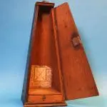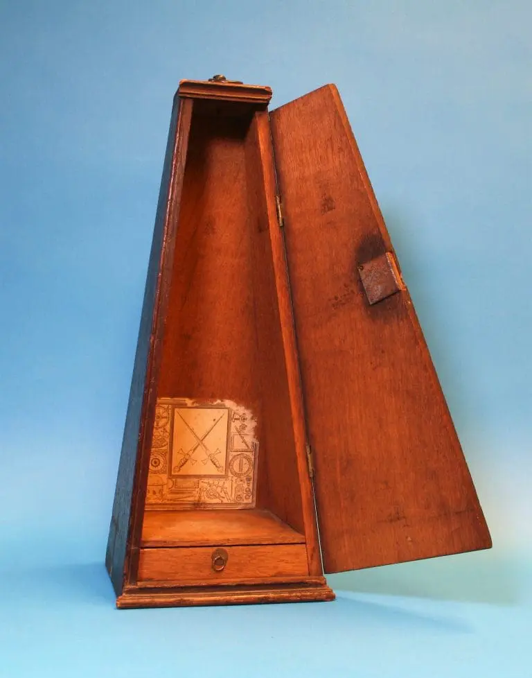In piramidale eikenhouten kist met slotplaat, slotje, lade en draagoog.