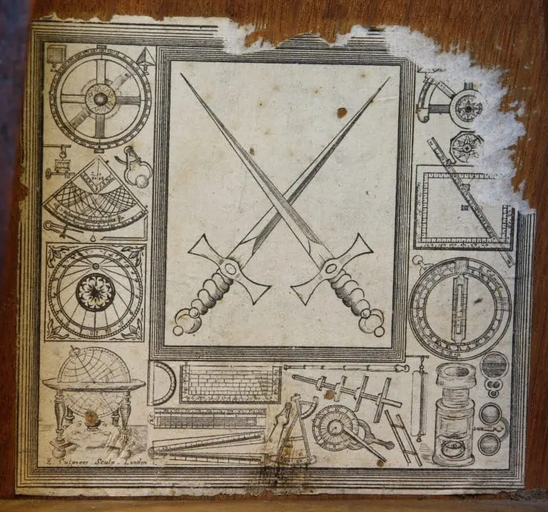 Het etiket van Culpeper tegen de achterwand is gelijk aan no. 106 uit H.R. Calvert (Science Museum, Scientific Trade Cards in the Science Museum Collection, London 1971). De signering van de graveur is ‘E. Culpeper Sculp. London’.